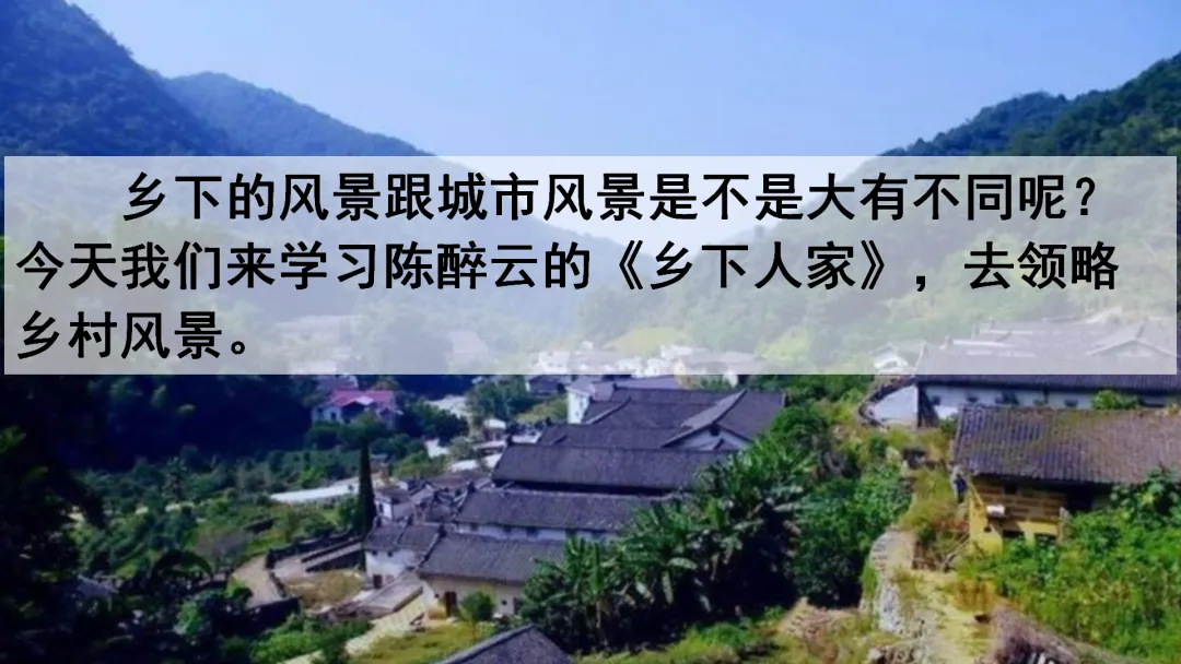 教师导入新课:同学们,通过第一课的学习,我们感受到了乡下独特的风景。那么乡下的风景跟城市风景是不是大有不同呢?今天我们来学习陈醉云的《乡下人家》,去领略乡村风景。板书课题。