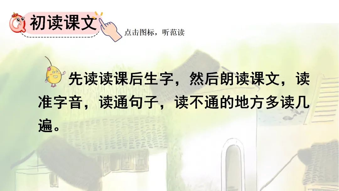 1.(1)自读课文,要求:先读读课后生字,然后朗读课文,读准字音,读通句子,读不通的地方多读几遍。(出示课件4)