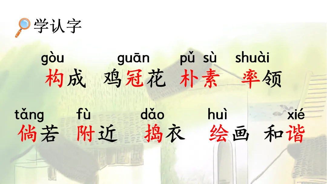 1.认识“构、冠”等 10 个会认字,正确书写“构、饰”等 15个会写字,会写“屋檐、构成”等 14个词语。