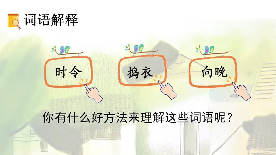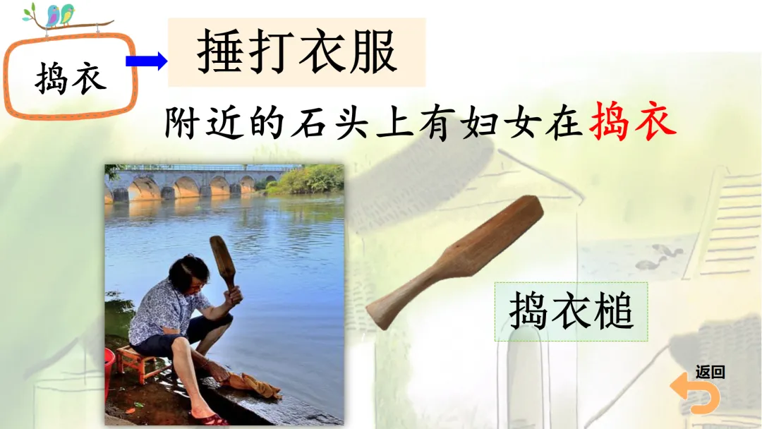 (2)借助画面(妇女们在河边拿着棒子洗衣服的图片),了解“捣衣”的意思。(出示课件8)