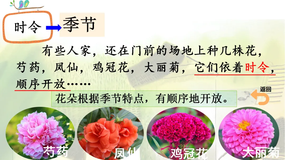 (1)先在文中圈出“时令”,读词语所在的句子,根据句子想想“依着时令”的意思。依着时令:花朵根据季节特点,有顺序地开放。(出示课件7)