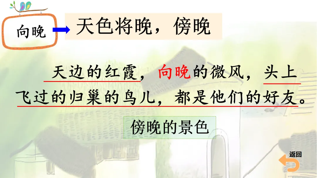 (3)同样运用联系上下文的方法理解“向晚”的意思。(出示课件9)