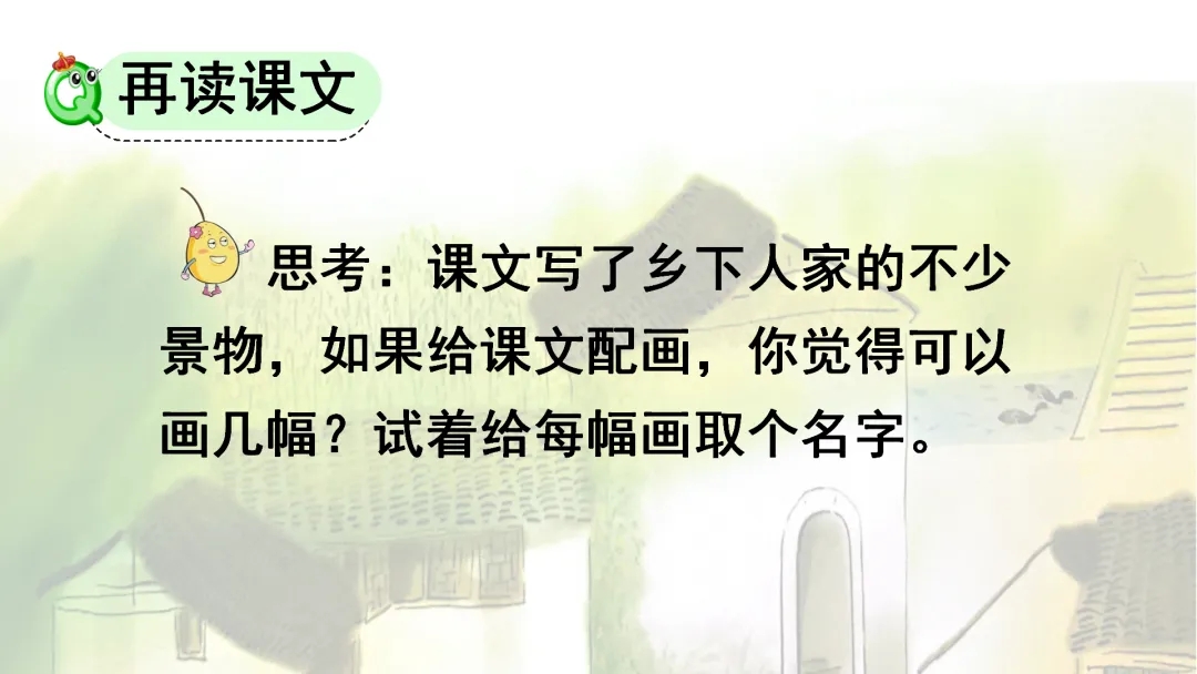 1.教师问:课文写了乡下人家的不少景物,如果给课文配画,你觉得可以画几幅?试着给每幅画取个名字。(出示课件12)