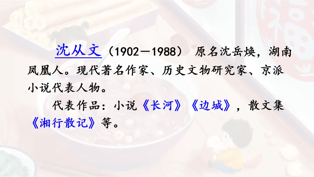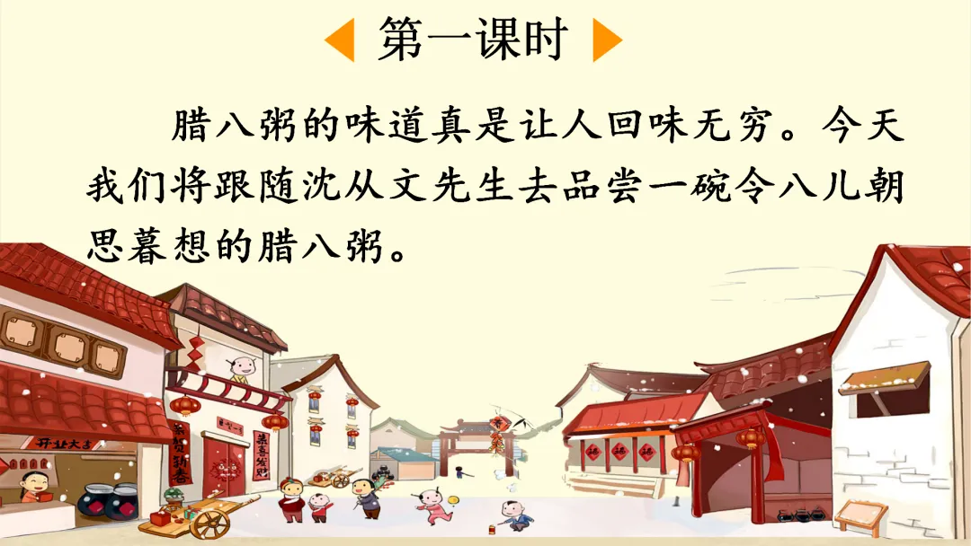 1.(出示课件3)谈话:俗语“腊七腊八,冻掉下巴”说明在腊月初七、初八这两天,天气很冷。于是,民成了一种风俗,即在腊八这一天要吃腊八粥,把下巴粘牢。今天,我们将跟随沈从文先生去品尝一碗令八儿朝思暮想的腊八粥。 (板书课题:腊八粥)