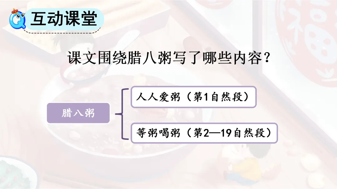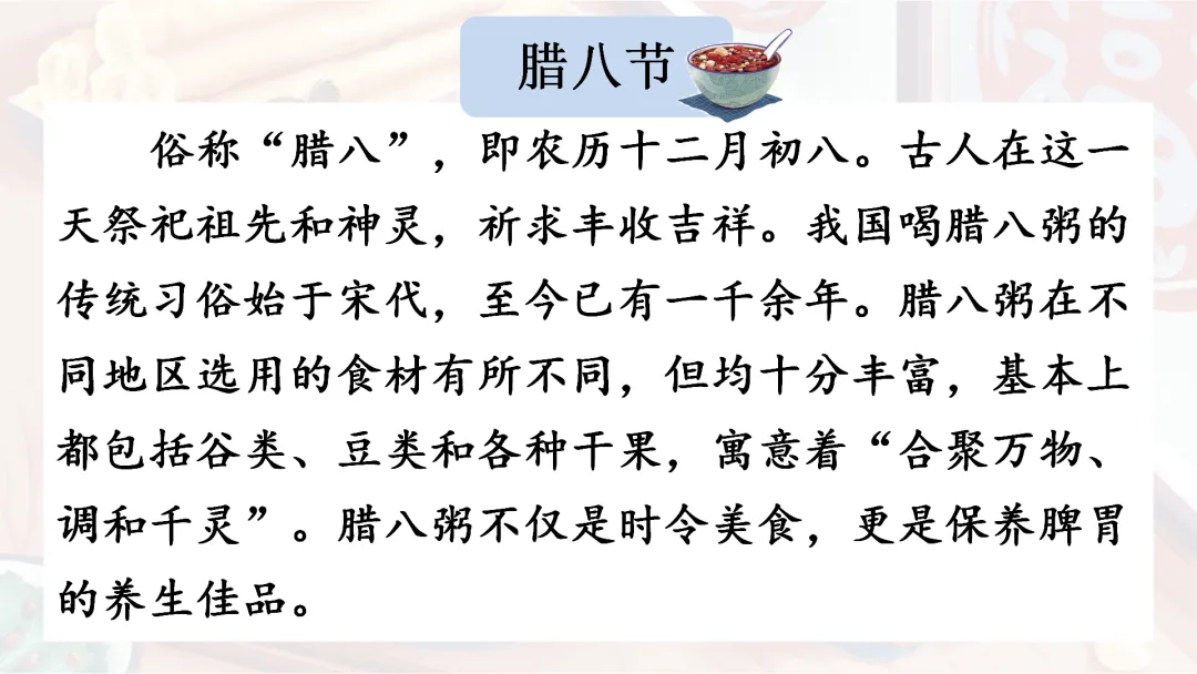 (设计意图:让学生了解腊八粥的相关内容,有助于学生对本课内容的理解,并激发学生学习的积极性和主动性。)