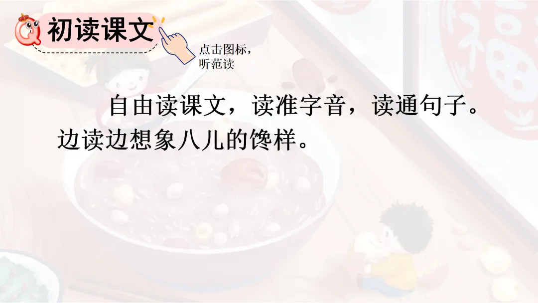 (出示课件29)教师提出要求:默读第13自然段,思考:八儿猜想腊八粥里有哪些食材,这些食材变成了什么样子。