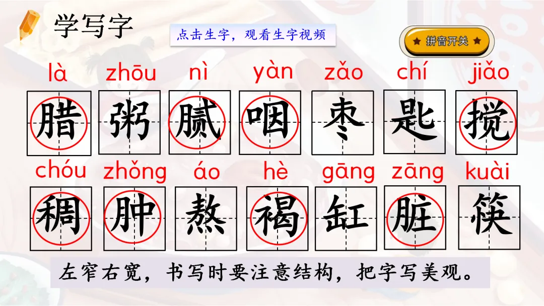 1.会写“腊、粥”等 14个字,会写“腊八粥、感觉”等 18个词语。