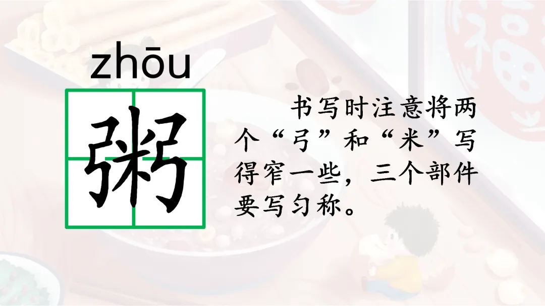 ②教师提出要求:粥—(出示课件10)书写时注意将两个“弓”和“米”写得窄一些,三个部件要写匀称。