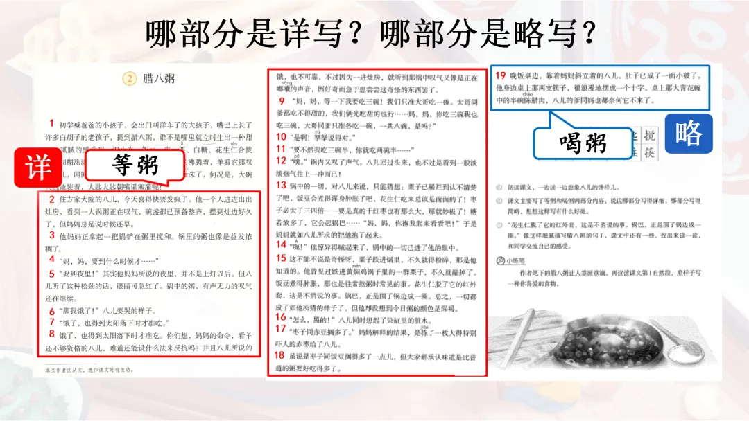学生汇报:“等粥”部分为详写,“喝粥”部分为略写