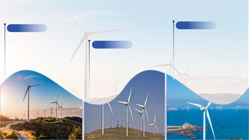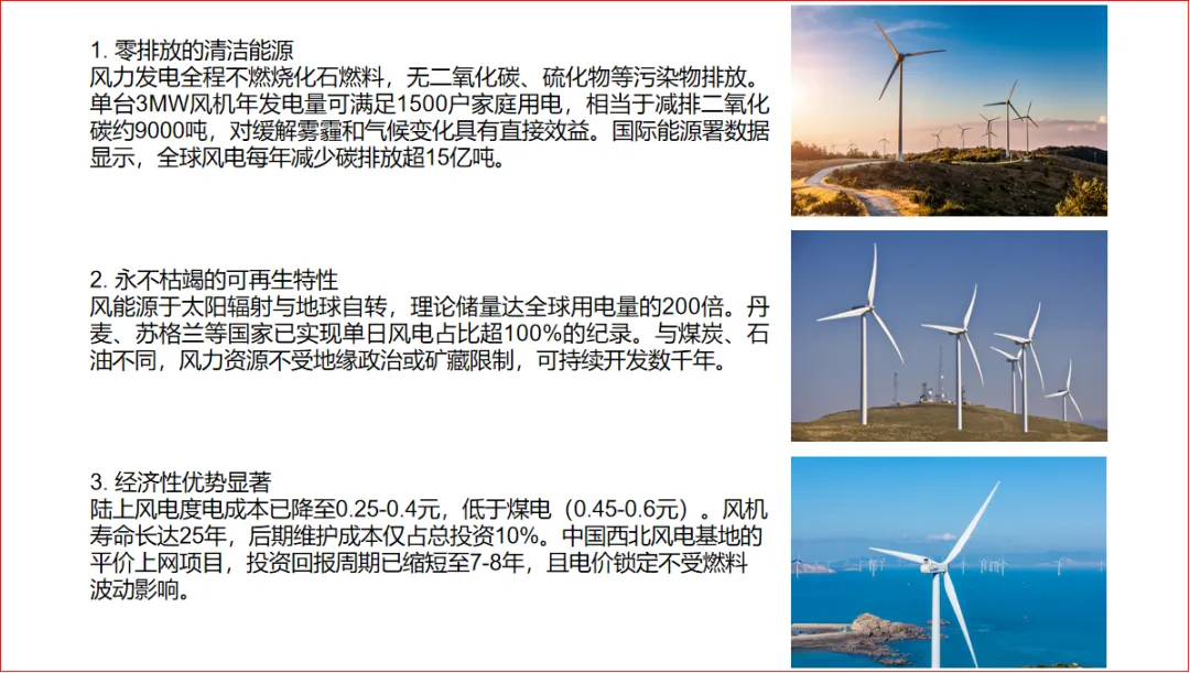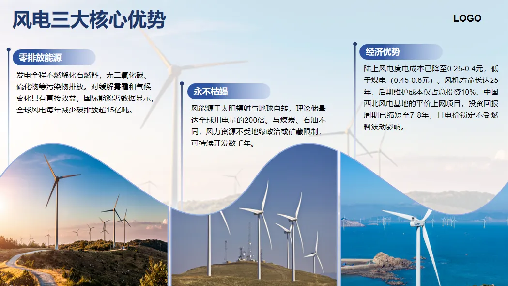 赶巧了!领导前两天发给我一份材料,是其他人给他做的,看出来问题了吗?纯纯的码字,贴图片。没有一丝的设计感。所以,领导就让我进行修改:保留所有文字,还要图文并茂,有层次感,整个PPT设计逻辑清晰。先看这页PPT的文字内容:描写的是风电方面的信息;进一步分析发现是关于“风电三大核心优势”的。1、选择其中一个图片设置成PPT页面背景,透明度调整到80%。2、在页面中插入一个矩形和一个双波形,调整大小,叠加两个形状,置于PPT页面下方。选中两个形状,在【合并形状】中选择【拆分】。删除多余形状。3、在页面中插入四矩形,依次等距排列。选中PPT页面中所有矩形在【合并形状】中选择【拆分】。删除多余形状。4、将原PPT中的图片复制到这个PPT页面中,依次将图片插入到形状中,插入方式:选中图片进行剪切(或Ctrl+X),点击右侧【填充】-【图片或纹理填充】-【图片填充】-下拉选择【剪切板】。再适当调整形状大小。4、插入三条直线依次放置在形状上方,调整粗细、渐变色,添加前段箭头(圆形)。5、在每条直线右上角添加一个圆角矩形,调整渐变色。这样,一个三段式图文排版就做好了。是不是立马有了设计感?而且既保留了所有文字,还图文并茂,有层次感,整个PPT设计逻辑清晰。