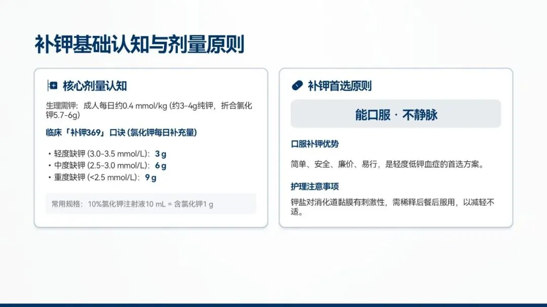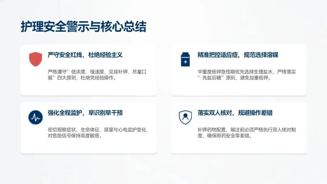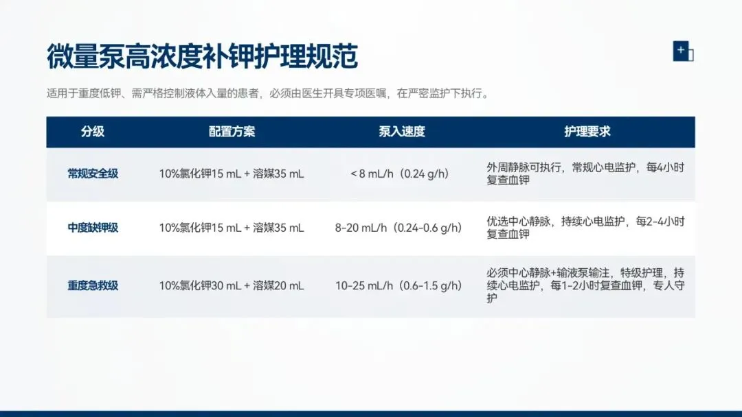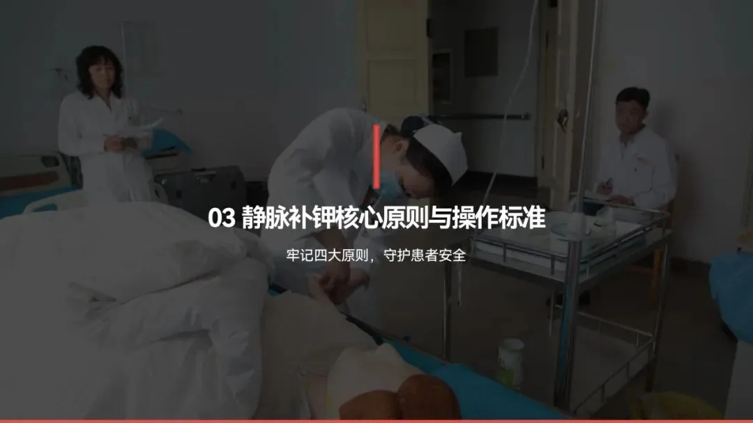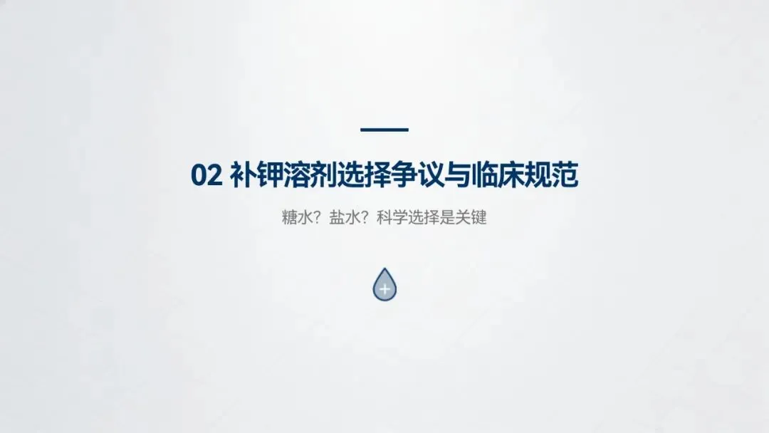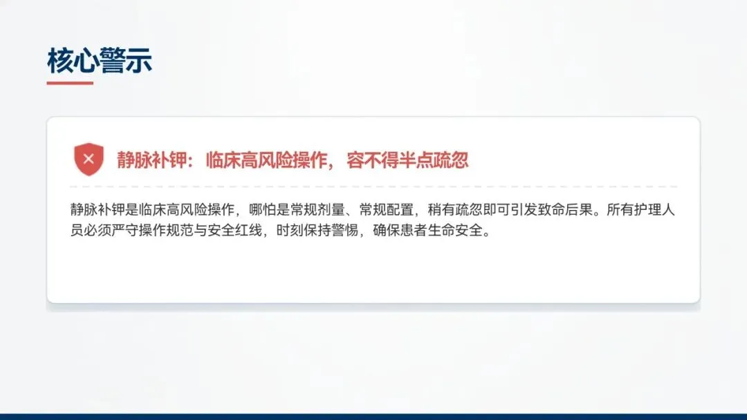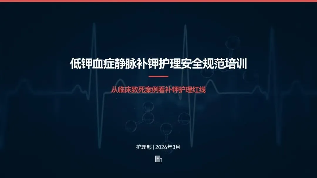 这是一个真实的案例。患者李某因突发四肢乏力入院,检查发现血钾仅为2.06 mmol/L,属于严重低钾血症。医生给予了常规的静脉补钾和口服补钾治疗。大家可以看到,初始的处置方案看似合理。然而,仅仅在补钾开始后不到一小时,患者就突发心跳骤停,经全力抢救无效死亡。这个案例的结局令人痛心,也让我们不得不反思,问题究竟出在哪里?这个案例给我们的核心警示是:静脉补钾是一项高风险操作,容不得半点疏忽。即使是常规的剂量和配置,也可能因为某个环节的失误而导致灾难性的后果。因此,我们必须时刻绷紧安全这根弦,严格遵守操作规范。接下来,我们进入第二部分,探讨一个在临床中经常遇到的问题:补钾时,溶剂应该选择糖水还是盐水?这背后有什么科学依据和临床规范呢?我们可以看到,不同的权威资料对于补钾溶剂的选择给出了不同的建议,有的推荐盐水,有的推荐糖水,这确实让我们在临床实践中感到困惑。那么,到底应该如何选择呢?临床实践中,我们遵循“先盐后糖”的原则。对于严重低钾血症的患者,急性期应首选生理盐水作为溶剂,以避免葡萄糖可能带来的血钾进一步降低的风险。当血钾接近正常后,再考虑使用葡萄糖溶液,以促进细胞内钾的补充。同时,我们也要纠正一个误区,并非所有情况下都绝对不能用糖水,关键在于患者的血钾水平和临床状态。了解了溶剂选择的规范后,我们进入本次培训的核心部分:静脉补钾的四大核心原则与操作标准。这是我们必须牢牢掌握的内容。在进行静脉补钾前,我们需要掌握一些基础认知。首先是剂量原则,我们有一个“补钾369”的口诀,可以帮助我们快速估算每日的补钾量。更重要的是,我们要牢记“能口服不静脉”的原则,口服补钾是最安全的方式,应作为首选。静脉补钾的第一个原则是“低浓度”,外周静脉补钾的浓度绝对不能超过0.3%。第二个原则是“慢速度”,常规情况下每小时补钾量不能超过1克。这两个是硬性规定,是保障患者安全的第一道防线,我们必须严格遵守。第三个原则是“见尿补钾”,这是防止高钾血症的关键。在补钾前,我们必须确认患者有足够的尿量,通常要求每小时尿量达到30-40毫升,或者每日尿量不少于500毫升。第四个原则是“全程监护”,从补钾前的评估,到补钾中的密切观察,再到补钾后的复查,每一个环节都不能忽视。特别是在补钾过程中,要密切监测患者的生命体征和心电监护,确保安全。对于一些特殊情况,比如重度低钾或需要严格控制液体入量的患者,我们会使用微量泵进行高浓度补钾。这张表格详细列出了不同分级下的配置方案、泵入速度和相应的护理要求。需要特别强调的是,这种方式风险极高,必须在医生的严密监控下进行。掌握了操作原则后,我们来学习第四部分:补钾全程的风险防控与监测要点。如何识别高危人群,如何通过有效的监测来预警风险,是我们保障患者安全的重要手段。在补钾过程中,我们要特别关注那些高危人群,对他们进行更严密的监测。监测的重点包括心电监护、血钾复查和尿量监测。同时,我们要时刻警惕那些早期的危险信号,一旦发现,必须立即采取措施。尽管我们做了充分的预防,但意外仍有可能发生。因此,掌握紧急不良事件的应急处置流程至关重要。这一部分将为大家介绍如何快速、规范地应对各种突发情况。这里列出了三种最常见的紧急情况及其处置流程:低钾血症加重导致的心跳骤停、高钾血症以及药物外渗。大家需要牢记这些步骤,确保在紧急情况下能够迅速、正确地采取行动。最后,我们对本次培训进行总结。请大家牢记这四点核心警示:严守安全红线,规范选择溶媒,强化全程监护,落实双人核对。这些是我们保障患者安全的根本。培训到此结束。希望通过今天的学习,大家能够将这些安全规范内化于心,外化于行,真正做到守护患者安全,严守护理底线。接下来是提问与交流环节,欢迎大家踊跃提问。PPT下载方法: