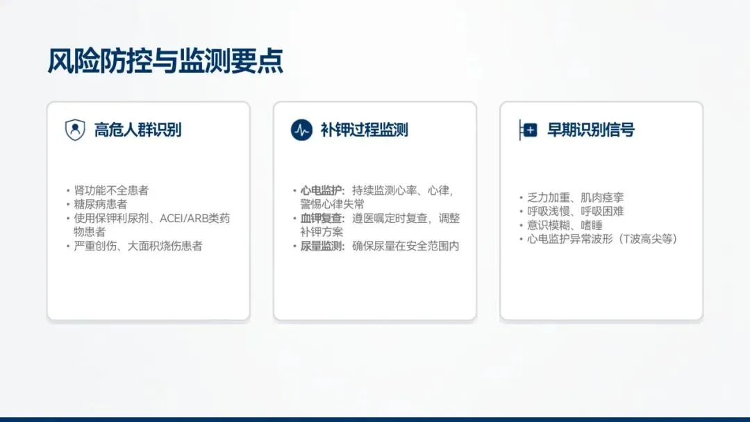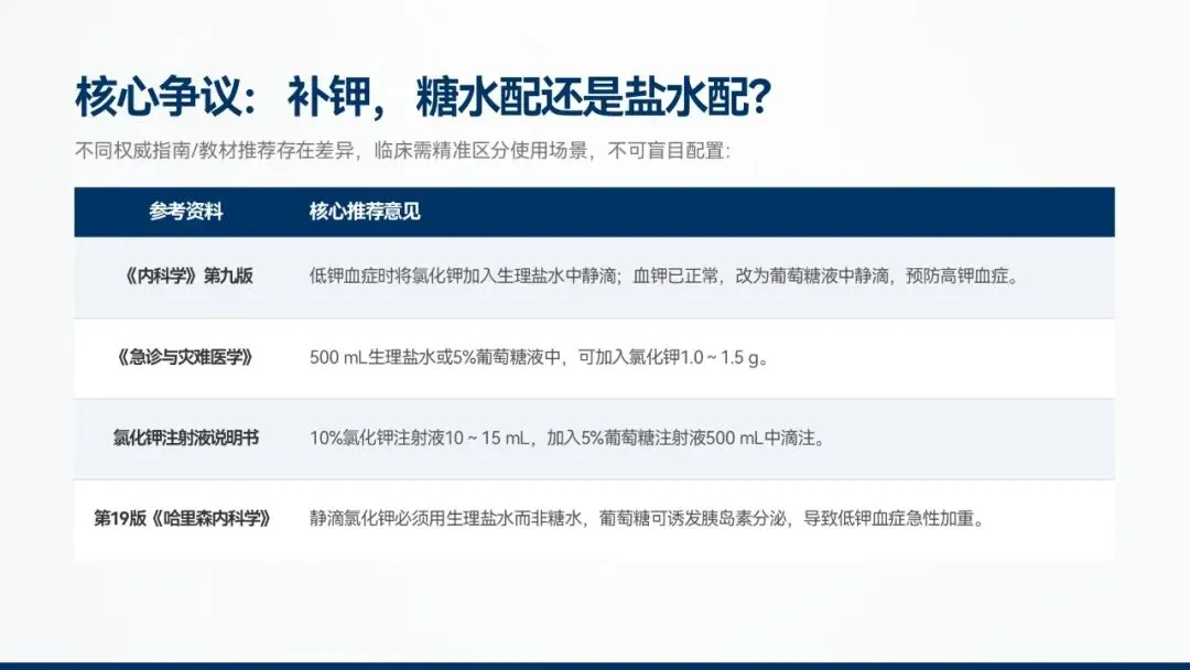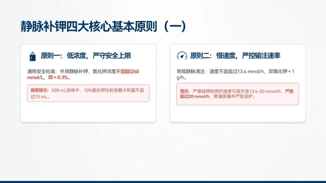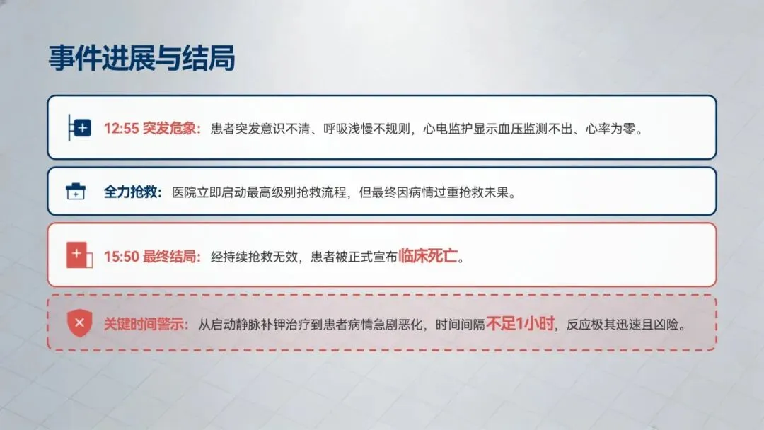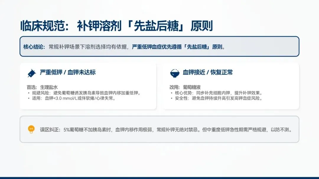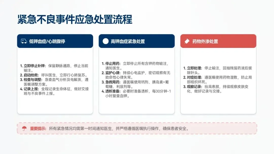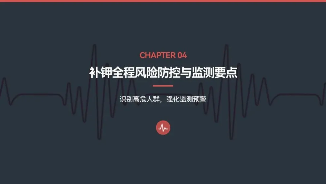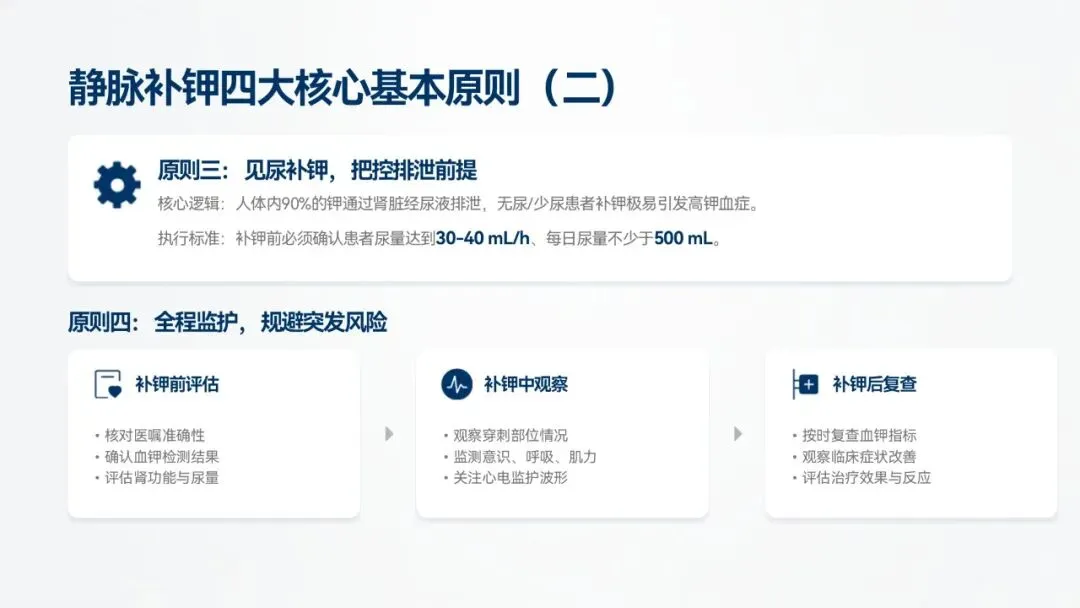 这是一个真实的案例。患者李某因突发四肢乏力入院,检查发现血钾仅为2.06 mmol/L,属于严重低钾血症。医生给予了常规的静脉补钾和口服补钾治疗。大家可以看到,初始的处置方案看似合理。然而,仅仅在补钾开始后不到一小时,患者就突发心跳骤停,经全力抢救无效死亡。这个案例的结局令人痛心,也让我们不得不反思,问题究竟出在哪里?这个案例给我们的核心警示是:静脉补钾是一项高风险操作,容不得半点疏忽。即使是常规的剂量和配置,也可能因为某个环节的失误而导致灾难性的后果。因此,我们必须时刻绷紧安全这根弦,严格遵守操作规范。接下来,我们进入第二部分,探讨一个在临床中经常遇到的问题:补钾时,溶剂应该选择糖水还是盐水?这背后有什么科学依据和临床规范呢?我们可以看到,不同的权威资料对于补钾溶剂的选择给出了不同的建议,有的推荐盐水,有的推荐糖水,这确实让我们在临床实践中感到困惑。那么,到底应该如何选择呢?临床实践中,我们遵循“先盐后糖”的原则。对于严重低钾血症的患者,急性期应首选生理盐水作为溶剂,以避免葡萄糖可能带来的血钾进一步降低的风险。当血钾接近正常后,再考虑使用葡萄糖溶液,以促进细胞内钾的补充。同时,我们也要纠正一个误区,并非所有情况下都绝对不能用糖水,关键在于患者的血钾水平和临床状态。了解了溶剂选择的规范后,我们进入本次培训的核心部分:静脉补钾的四大核心原则与操作标准。这是我们必须牢牢掌握的内容。在进行静脉补钾前,我们需要掌握一些基础认知。首先是剂量原则,我们有一个“补钾369”的口诀,可以帮助我们快速估算每日的补钾量。更重要的是,我们要牢记“能口服不静脉”的原则,口服补钾是最安全的方式,应作为首选。静脉补钾的第一个原则是“低浓度”,外周静脉补钾的浓度绝对不能超过0.3%。第二个原则是“慢速度”,常规情况下每小时补钾量不能超过1克。这两个是硬性规定,是保障患者安全的第一道防线,我们必须严格遵守。第三个原则是“见尿补钾”,这是防止高钾血症的关键。在补钾前,我们必须确认患者有足够的尿量,通常要求每小时尿量达到30-40毫升,或者每日尿量不少于500毫升。第四个原则是“全程监护”,从补钾前的评估,到补钾中的密切观察,再到补钾后的复查,每一个环节都不能忽视。特别是在补钾过程中,要密切监测患者的生命体征和心电监护,确保安全。对于一些特殊情况,比如重度低钾或需要严格控制液体入量的患者,我们会使用微量泵进行高浓度补钾。这张表格详细列出了不同分级下的配置方案、泵入速度和相应的护理要求。需要特别强调的是,这种方式风险极高,必须在医生的严密监控下进行。掌握了操作原则后,我们来学习第四部分:补钾全程的风险防控与监测要点。如何识别高危人群,如何通过有效的监测来预警风险,是我们保障患者安全的重要手段。在补钾过程中,我们要特别关注那些高危人群,对他们进行更严密的监测。监测的重点包括心电监护、血钾复查和尿量监测。同时,我们要时刻警惕那些早期的危险信号,一旦发现,必须立即采取措施。尽管我们做了充分的预防,但意外仍有可能发生。因此,掌握紧急不良事件的应急处置流程至关重要。这一部分将为大家介绍如何快速、规范地应对各种突发情况。这里列出了三种最常见的紧急情况及其处置流程:低钾血症加重导致的心跳骤停、高钾血症以及药物外渗。大家需要牢记这些步骤,确保在紧急情况下能够迅速、正确地采取行动。最后,我们对本次培训进行总结。请大家牢记这四点核心警示:严守安全红线,规范选择溶媒,强化全程监护,落实双人核对。这些是我们保障患者安全的根本。培训到此结束。希望通过今天的学习,大家能够将这些安全规范内化于心,外化于行,真正做到守护患者安全,严守护理底线。接下来是提问与交流环节,欢迎大家踊跃提问。PPT下载方法: