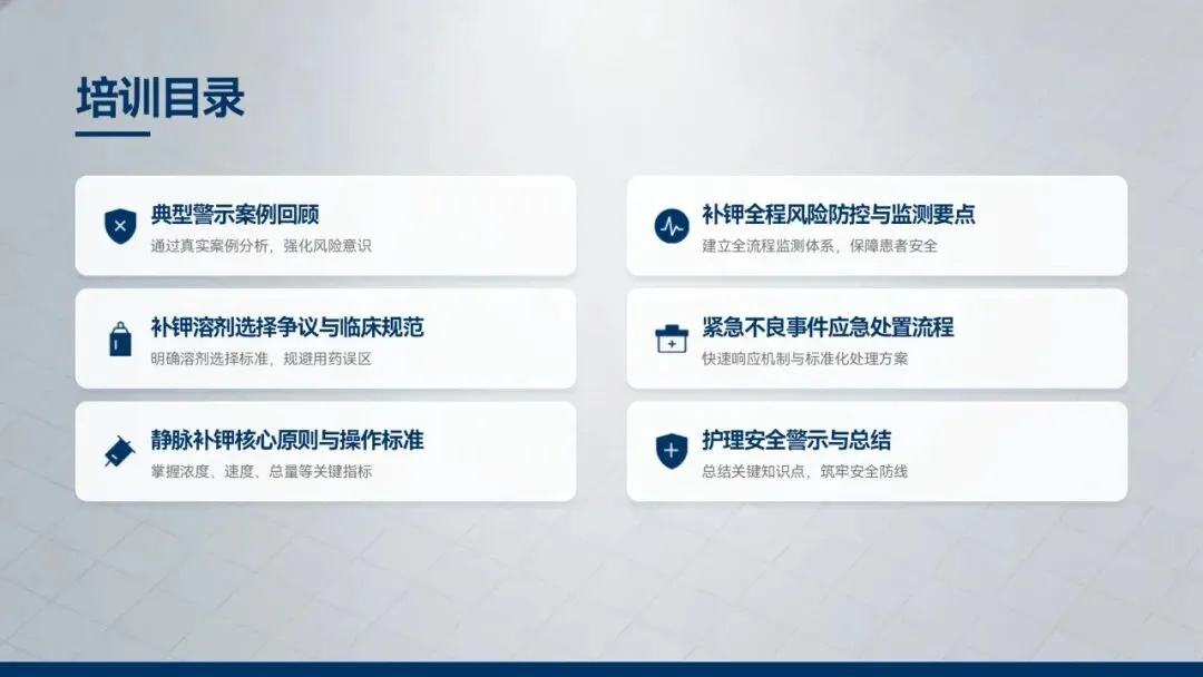 本次培训将分为六个部分。首先,我们会回顾一个触目惊心的警示案例;接着,探讨补钾溶剂选择的争议与规范;然后,重点讲解静脉补钾的四大核心原则;之后,我们会学习风险防控与监测要点;再介绍紧急不良事件的应急处置流程;最后进行总结与安全警示。希望通过这次系统的学习,大家能对静脉补钾的安全规范有更深刻的理解