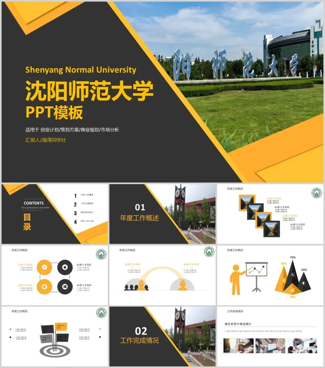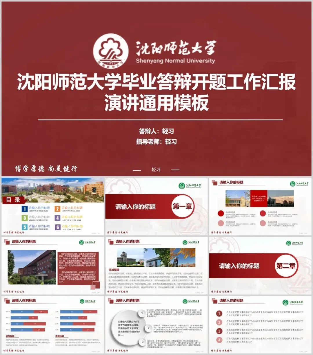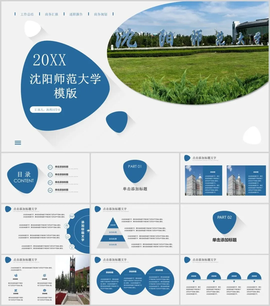 以上是我们为大家准备的沈阳师范大学的专属PPT模板,文中的所有板式都是可编辑的,大家可以上传替换自己喜欢的校园美景,做出具有自己风格的专属PPT哦!