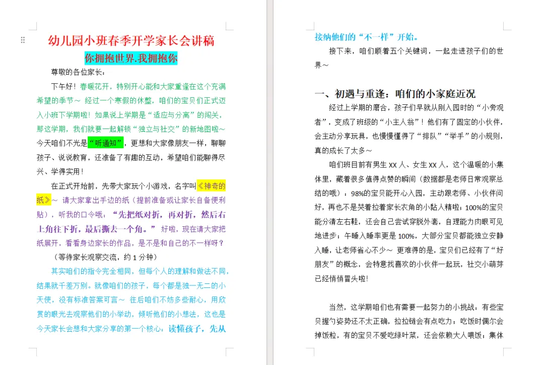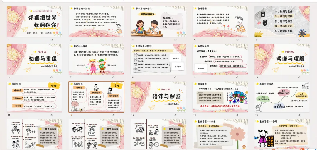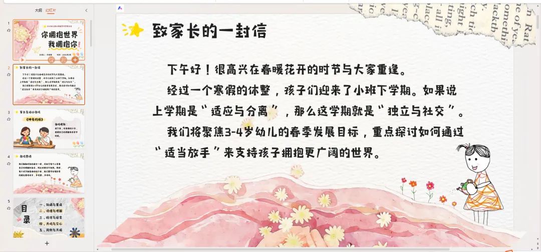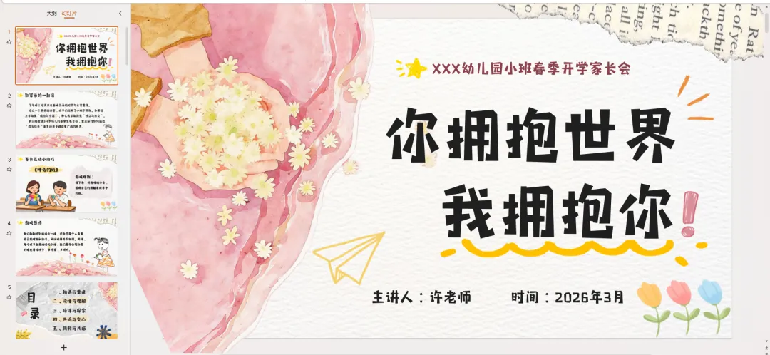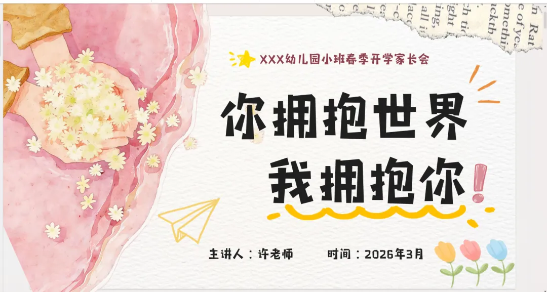 下午好!春暖花开,特别开心能和大家重逢在这个充满希望的季节~经过一个寒假的休整,咱们的宝贝们正式迈入小班下学期啦!如果说上学期是“适应与分离”的闯关,那这学期,我们就要一起解锁“独立与社交”的新地图啦~ 今天咱们不光是“听通知”,更想和大家像朋友一样,聊聊孩子、说说教育,还准备了有趣的互动,希望咱们能聊得尽兴、学得实用!