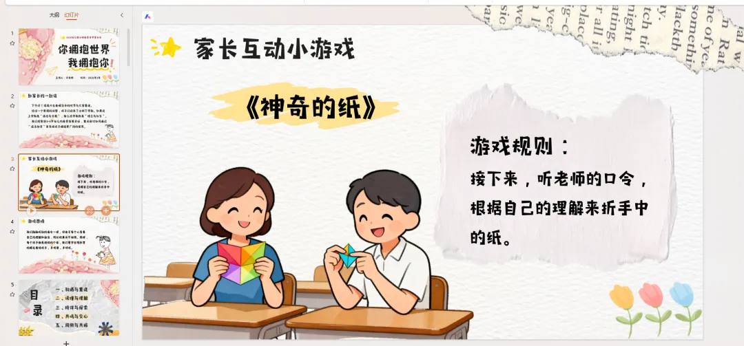 在正式开始前,先带大家玩个小游戏,名字叫《神奇的纸》~请大家拿出手边的纸(提前准备或让家长自备便利贴),听我的口令哦:“先把纸对折,再对折,然后右上角往下折,最后撕去一个角。”好啦,现在请大家把纸展开,看看身边家长的作品,是不是和自己的不一样呀?
