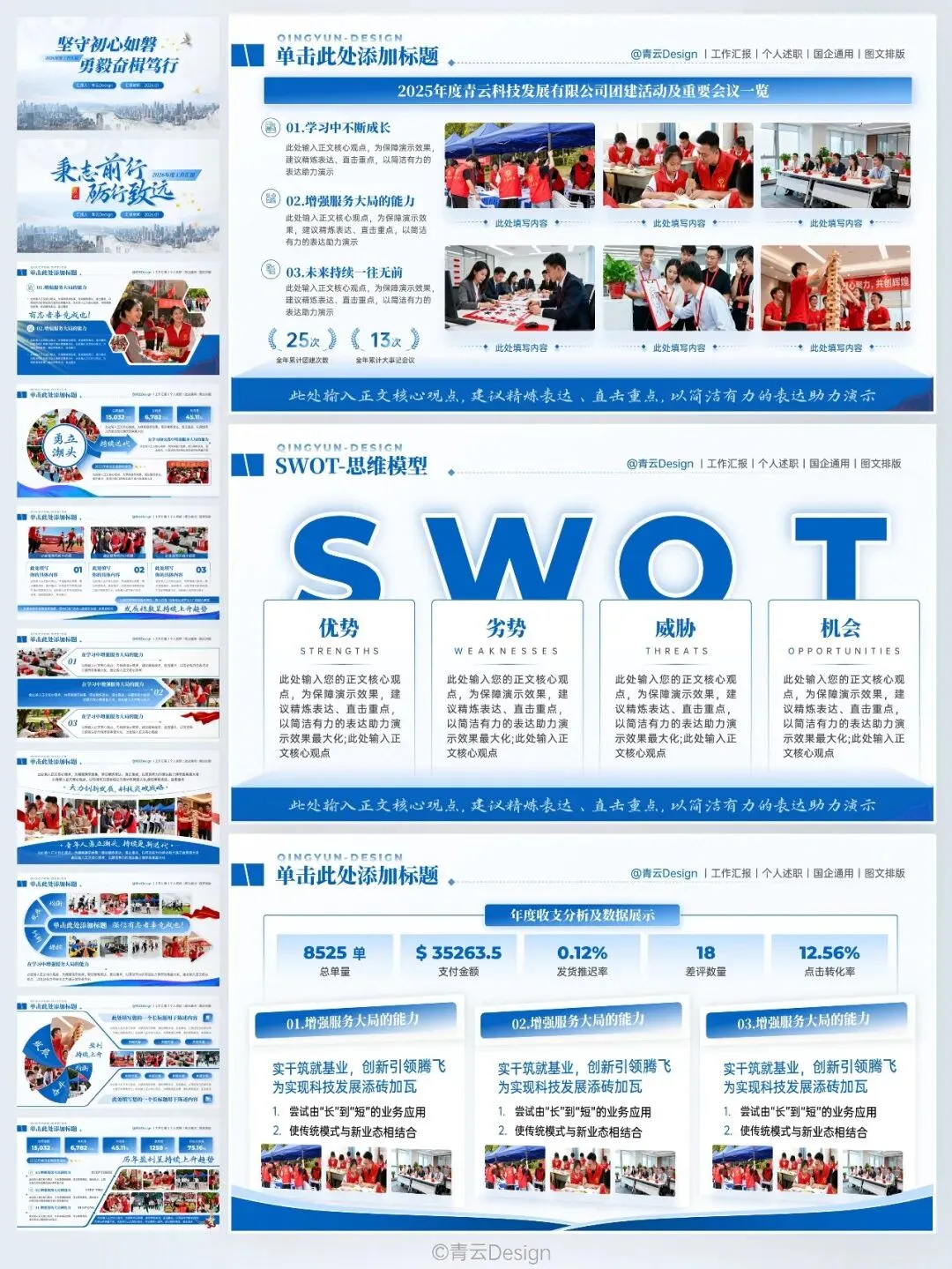 亮点在于自带思维模型与逻辑架构,帮你快速梳理思路,突出重点、层次分明,告别流水账式汇报。全模板可自由编辑,文字、数据、LOGO 轻松替换,大幅提升制作效率。