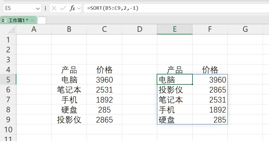 - 输入排序依据:想按“价格”排(第2列),所以加 `,2`(逗号别漏),变成 `=SORT(B5:C9,2`。
