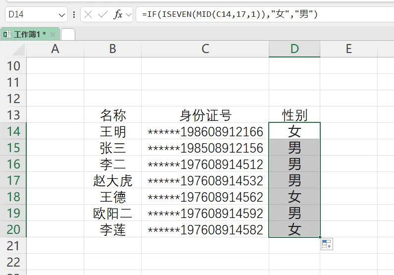 - 编辑栏输入公式:`=IF(ISEVEN(MID(C14,17,1)),"女","男")`(C14是身份证号所在格)。