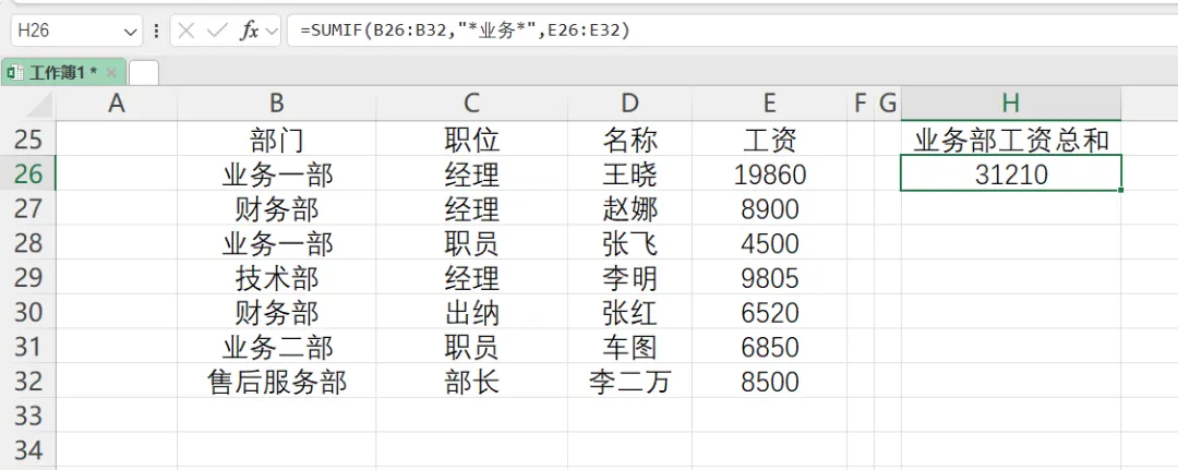 - 编辑栏输入公式:`=SUMIF(B26:B32,"业务",E26:E32)`(B26:B32是部门列,E26:E32是工资列)。