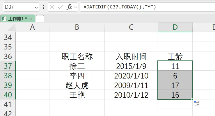 提示:你可以复制下面的数据到空表格直接套用此步骤。- 编辑栏输入公式:`=DATEDIF(C37,TODAY(),"Y")`(C37是入职时间格,TODAY()自动取今天日期)。