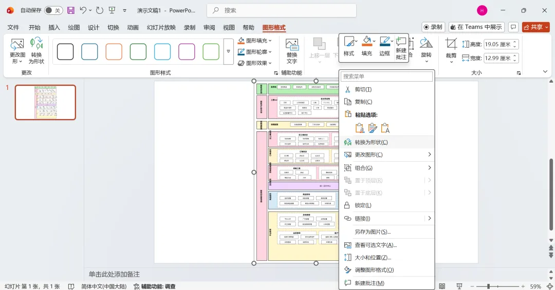 然后选中图片,并点击鼠标右键,在出来的菜单中选择“转换为形状”。