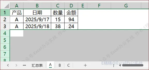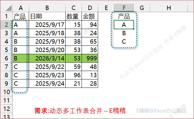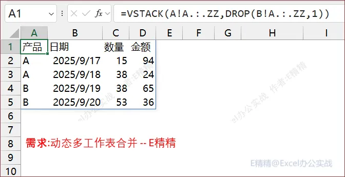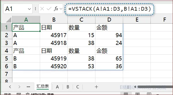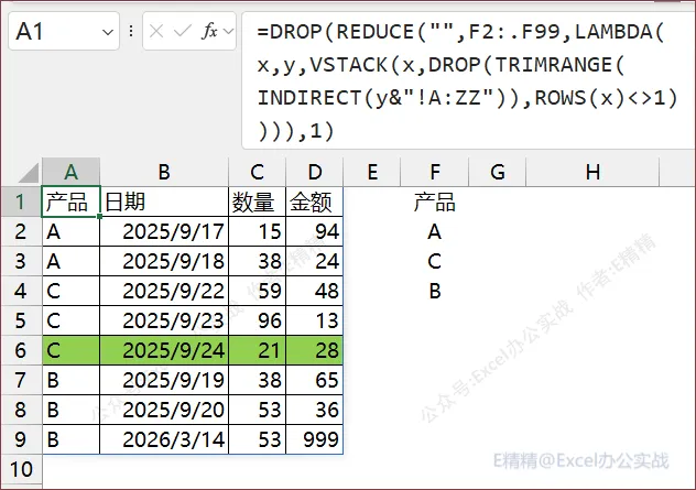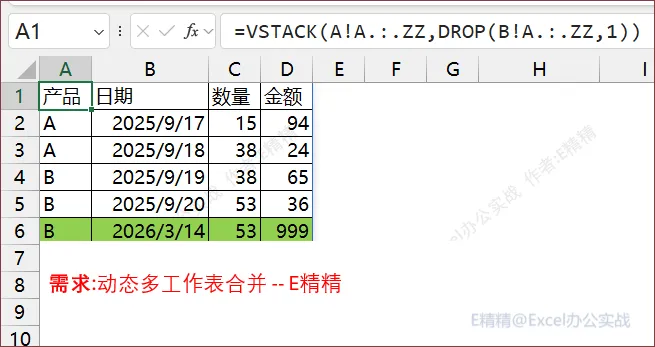一个VSTACK函数,也就是上下追加到一起,平时大家说的合并哈!但是你可能也发现了一些问题,这也不方便呀,第一、标题重复没处理,第二、每个表的数据区域不同,更新还要重新选择吗?不智能呀,没啥用!不要急,下面我们就来解决这两个难题,让其可以实战落地,真的可以用起来!只要保留第一个标题,其他的第一行去掉即可!后面还可以优化,比如先全部合并,然后筛选非标题行内容都是可以的!我们可以预留足够大的区域,比如 A.:.ZZ,这种写法就是最新的区域自动裁剪的语法糖,虽然我们选择A到ZZ列整列,但是最后会根据内容的列数和行数自动裁剪,大家可以参考一下结果!我们在产品中新增了一条今天的数据,汇总表也会自动更新进来!上面两个问题基本就解决了,但是目前只是固定的两个表,要是换成A、C产品合并怎么办?总不能每次手动修改吧,不实用!我们想要方便,可以设置一列放置要合并的工作表名称,然后公式遍历这个区域,实现动态合并!我们把要合并的工作表名称放在F列,按需配置,然后使用REDUCE循环每一个工作表进行VSTACK追加处理,具体公式如下!=DROP(