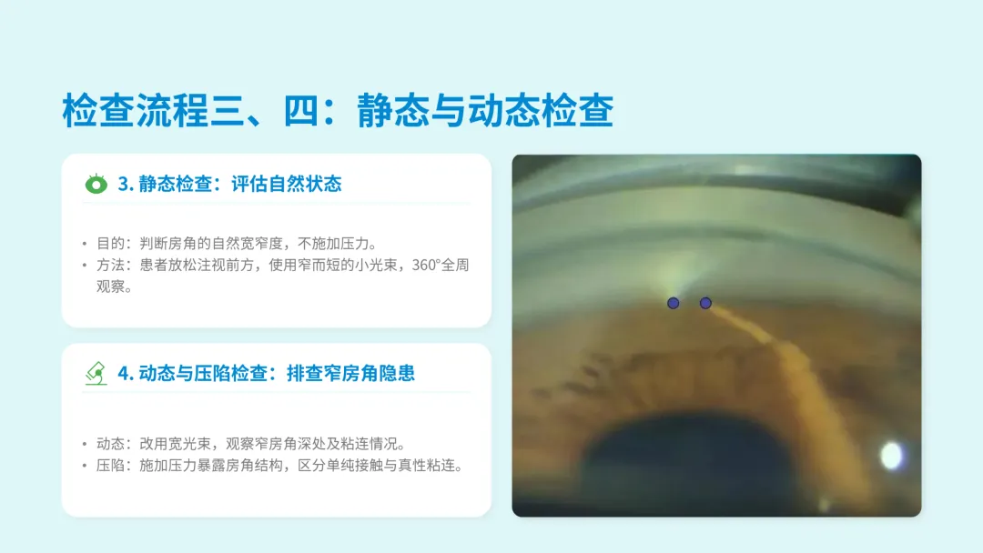 检查分为静态和动态两步。静态观察不施加任何压力,还原眼部最自然的状态,360° 查看通道宽窄;动态与轻压检查则更细致,针对偏窄的区域深入观察,区分是轻微接触还是真正粘连,避免遗漏潜在问题,让结果更准确。