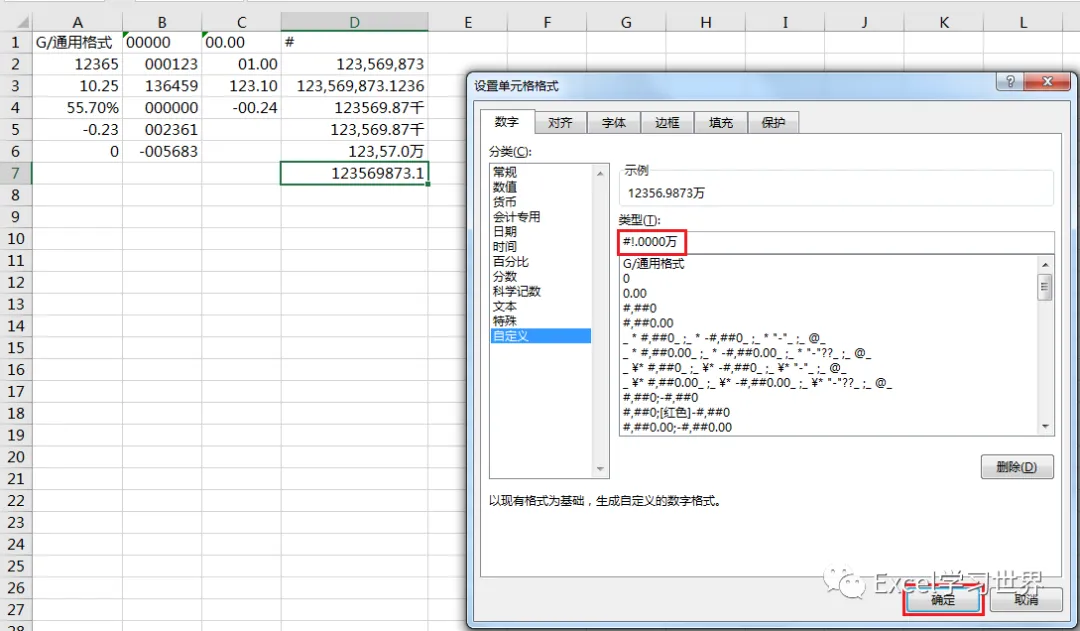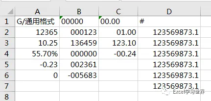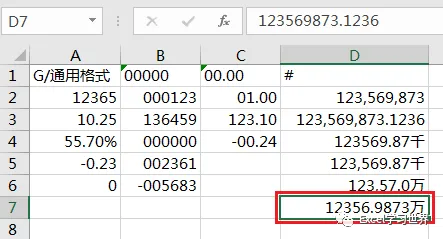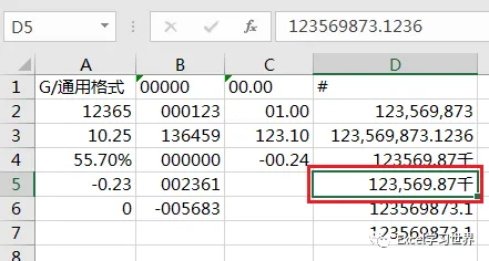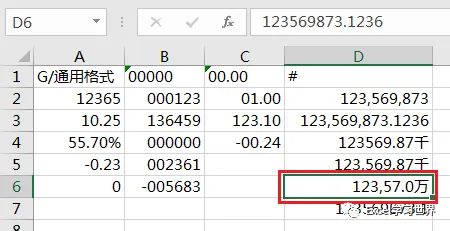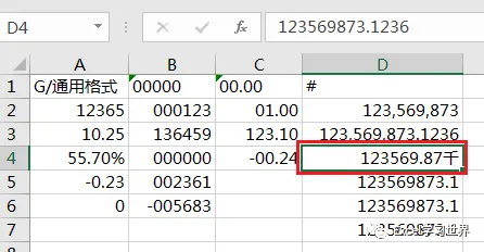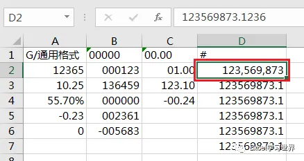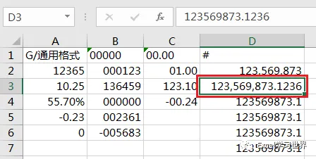 下面我们以实际案例来解释。D 列是一组相同的数值,通过不同的 # 设置,以不同的格式显示。