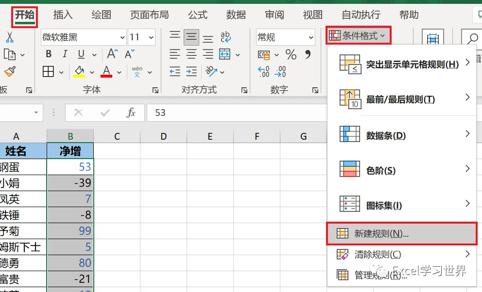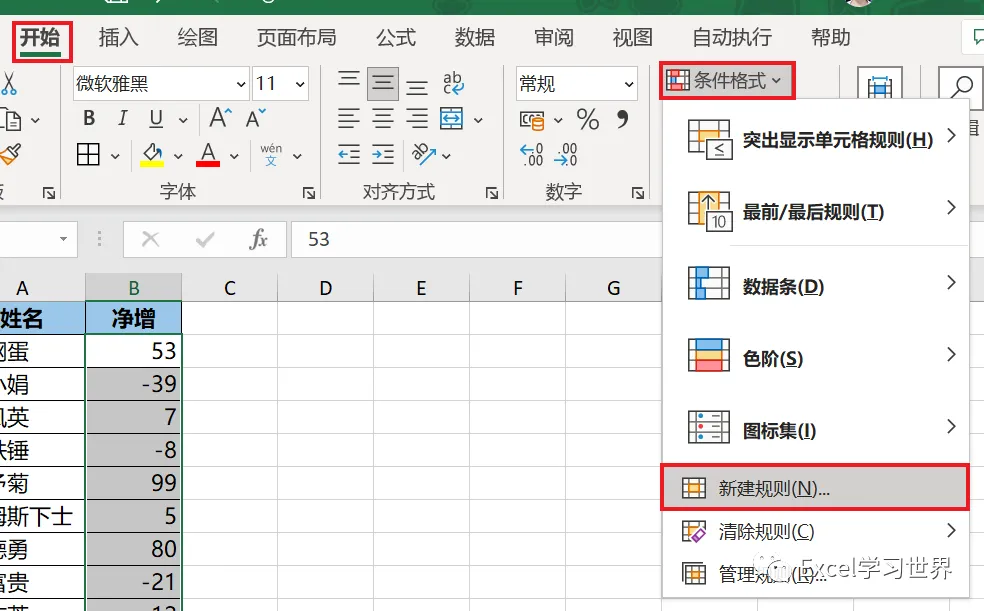 5. 保持选中的区域 --> 再次选择“开始”-->“条件格式”-->“新建规则”