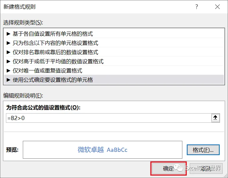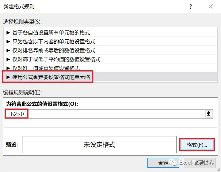 2. 在弹出的对话框中选择“使用公式确定要设置格式的单元格”--> 输入公式 =B2>0 --> 点击“格式”按钮