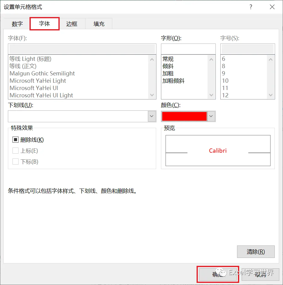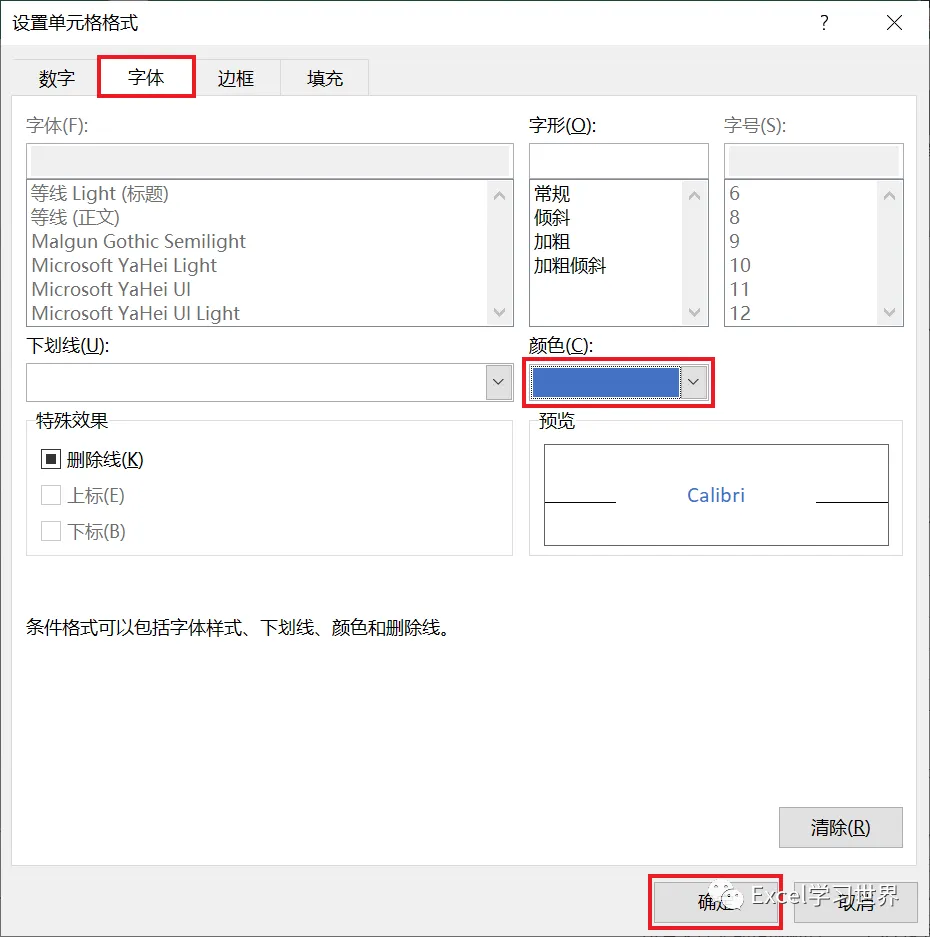 3. 在弹出的对话框中选择“字体”选项卡 --> 选择蓝色 --> 点击“确定”