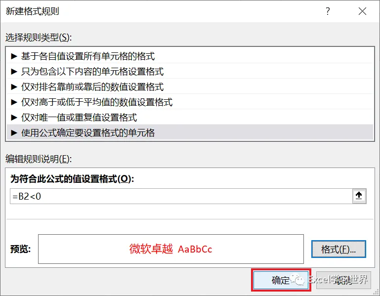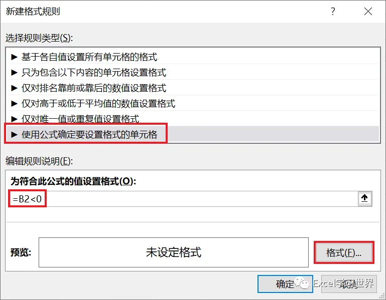 6. 选择“使用公式确定要设置格式的单元格”--> 输入公式 =B2<0 --> 点击“格式”