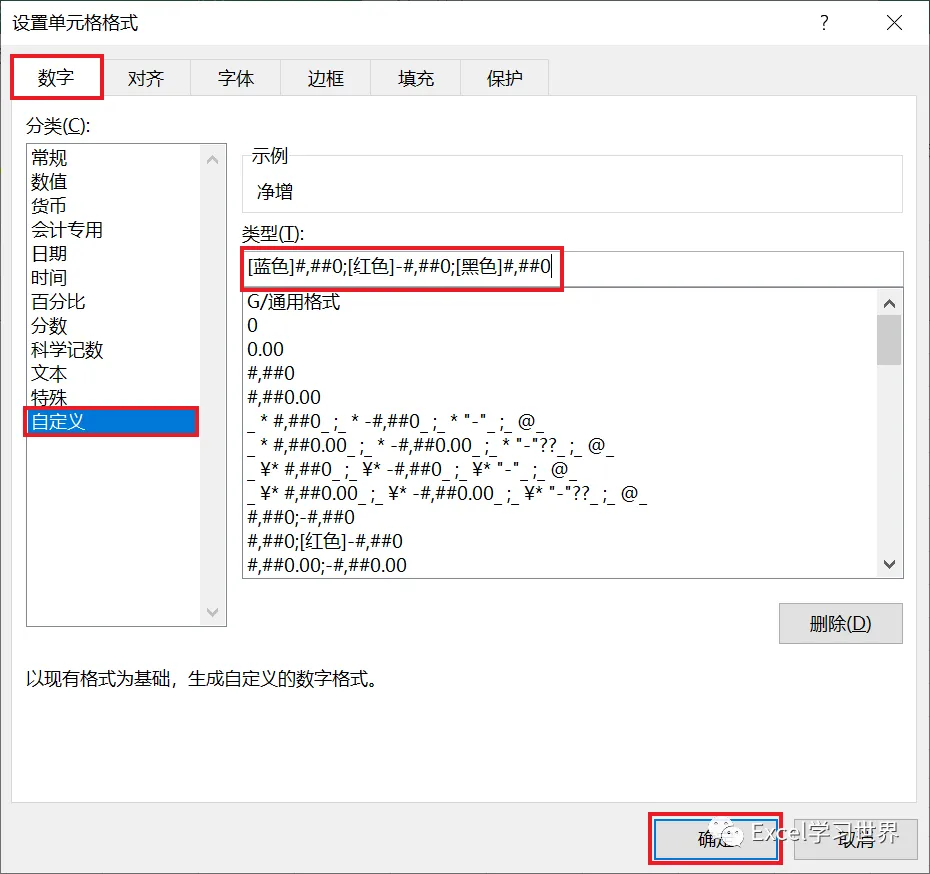 这里就设置了正负数和 0 值时的不同颜色,以及数值格式;
