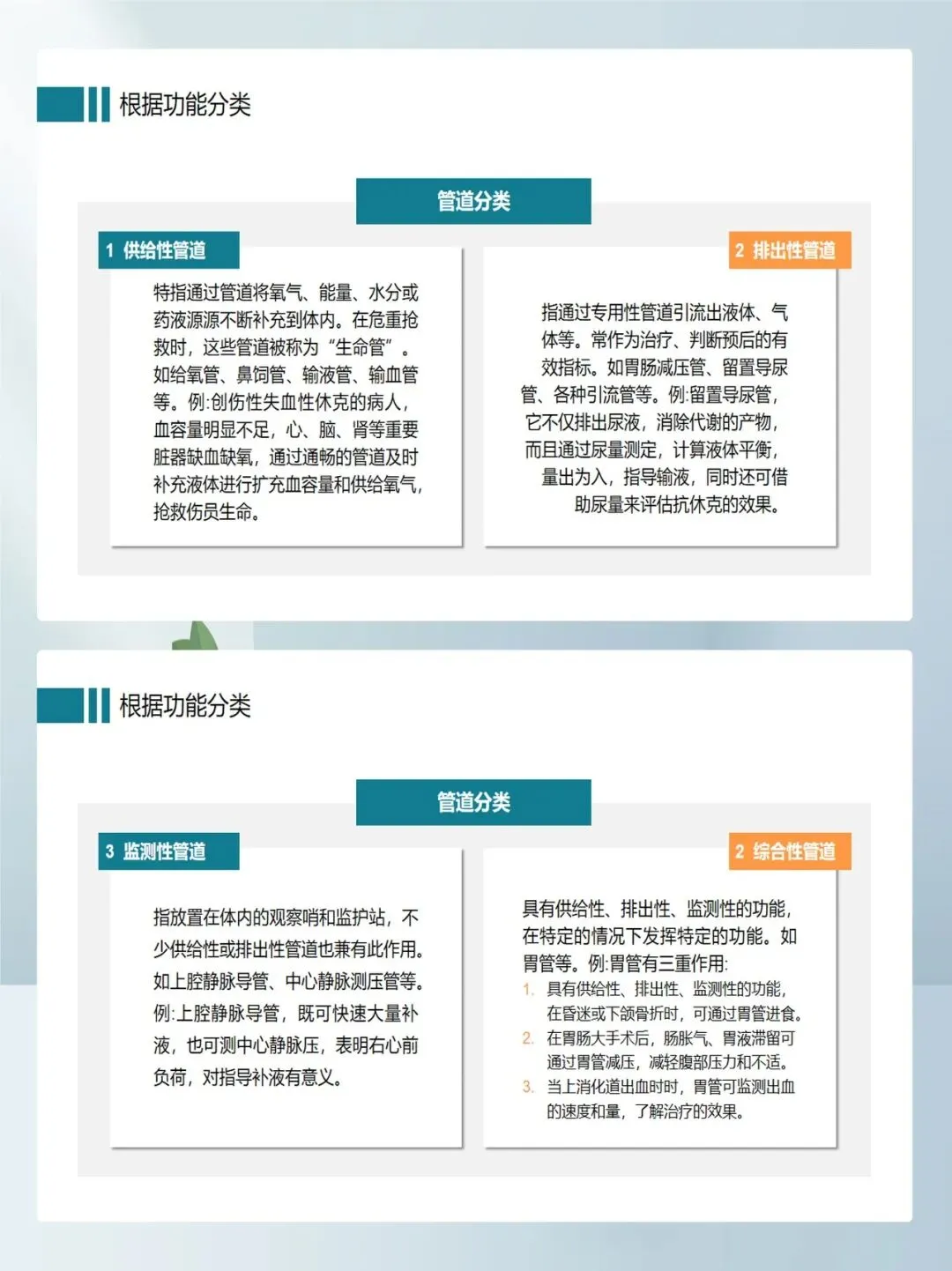 临床管道种类繁多,功能各异。我们可以将它们大致分为四类:一是“供给性”管道,如氧气管、输液管,为身体输送生命的养分和氧气;二是“排出性”管道,如尿管、胃肠减压管,帮助排出代谢废物与有害物质;三是“监测性”管道,如中心静脉导管,是观察病情的“前沿哨所”;四是具备多种功能的“综合性”管道,如胃管,既能喂食也能减压。