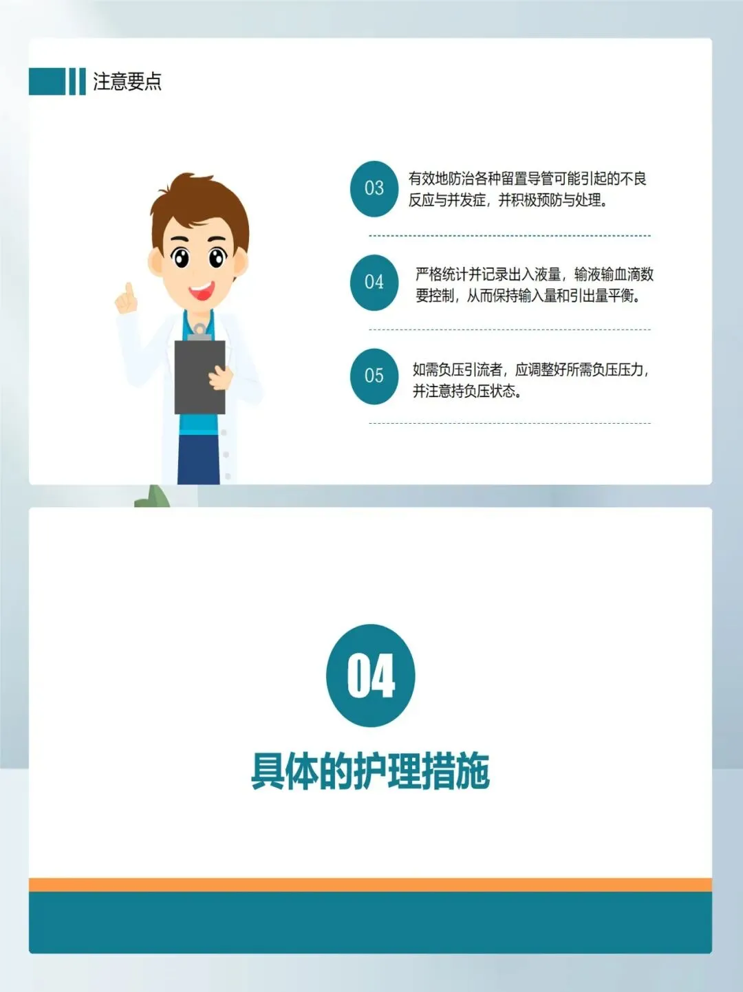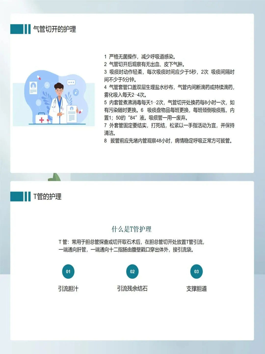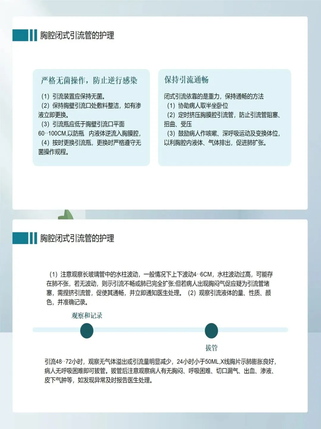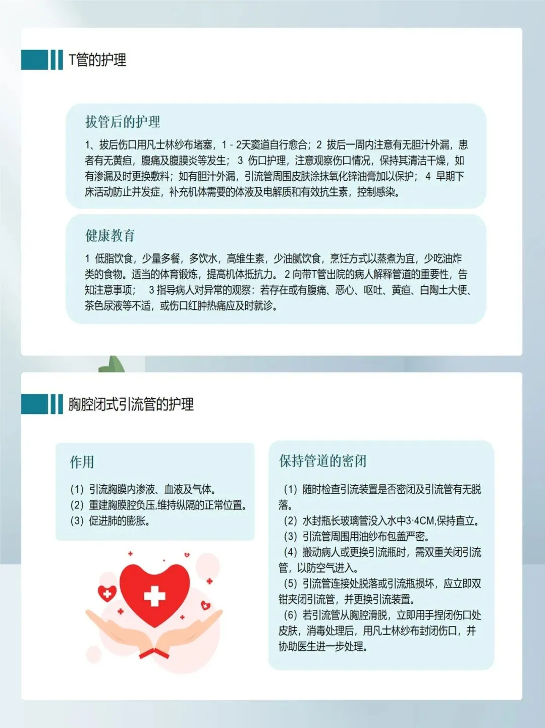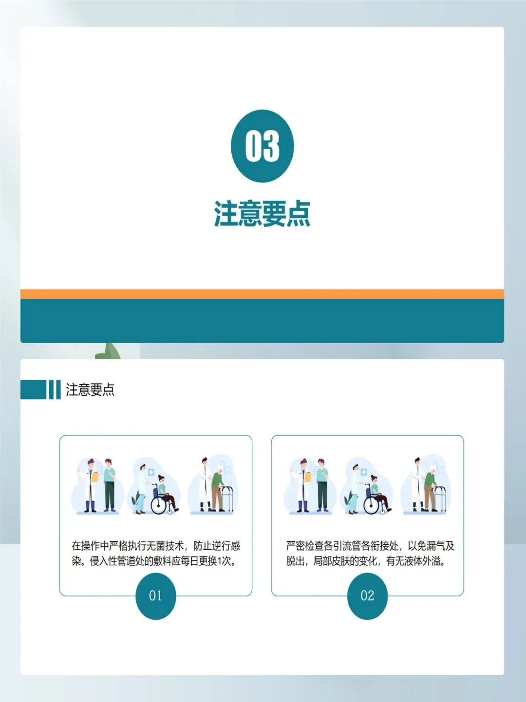 对于几种常见的重要管道,更有具体的护理“秘籍”。例如,胃管鼻饲时,需确认管道在胃内,鼻饲液温度要保持在38-40℃,并需定期更换。对于留置尿管的患者,需做好会阴护理,并鼓励多饮水(病情允许下)。气管插管或气管切开管的护理更是重中之重,需妥善固定、定期放气囊、严格无菌吸痰,并始终保持气道湿化。T管作为胆道术后重要引流管,需维持其通畅,并注意引流袋位置不能过高,以防胆汁逆流感染。而胸腔闭式引流管护理的关键在于维持系统的密闭与无菌,并依靠重力引流,需密切观察水柱波动。