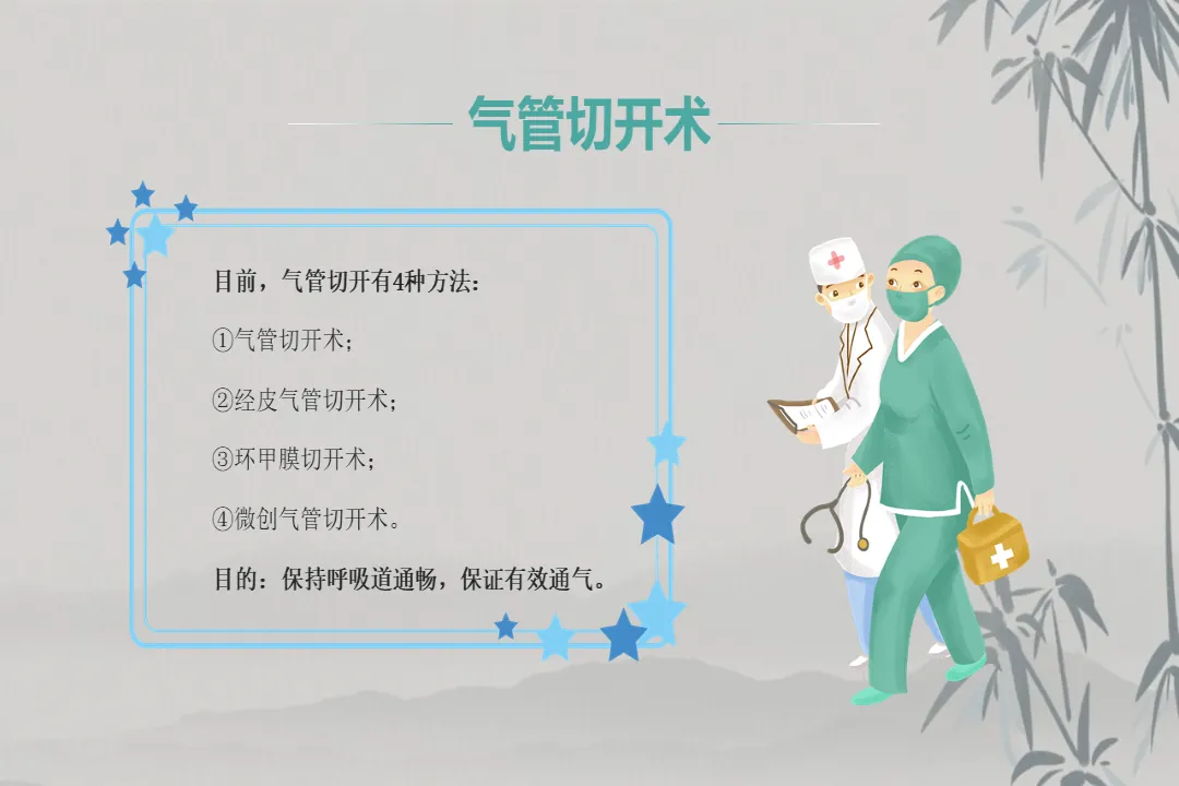 首先简单了解气管切开术,该手术通过切开颈段气管并置入金属气管套管,实现呼吸道通畅的目的,目前临床主要有气管切开术、经皮气管切开术、环甲膜切开术和微创气管切开术四种方式,核心目的均为保持呼吸道通畅,保证患者有效通气。