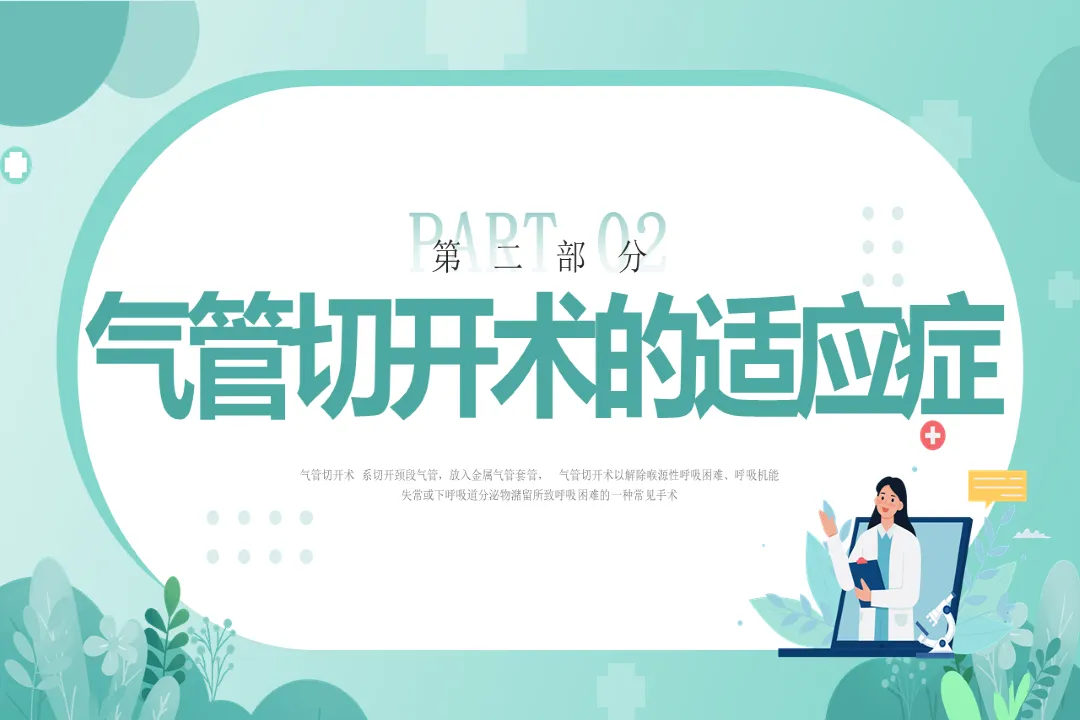 而临床中,气管切开术的适用场景主要包括喉梗阻、下呼吸道分泌物堵塞的患者,需要长期使用呼吸机辅助呼吸的患者,部分需要预防性气管切开的情况,以及无法经口鼻插管的气管内麻醉手术患者、呼吸道异物无法经喉取出的患者等。
