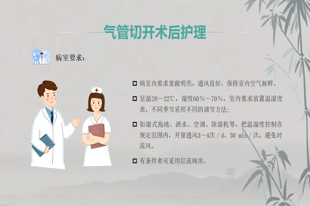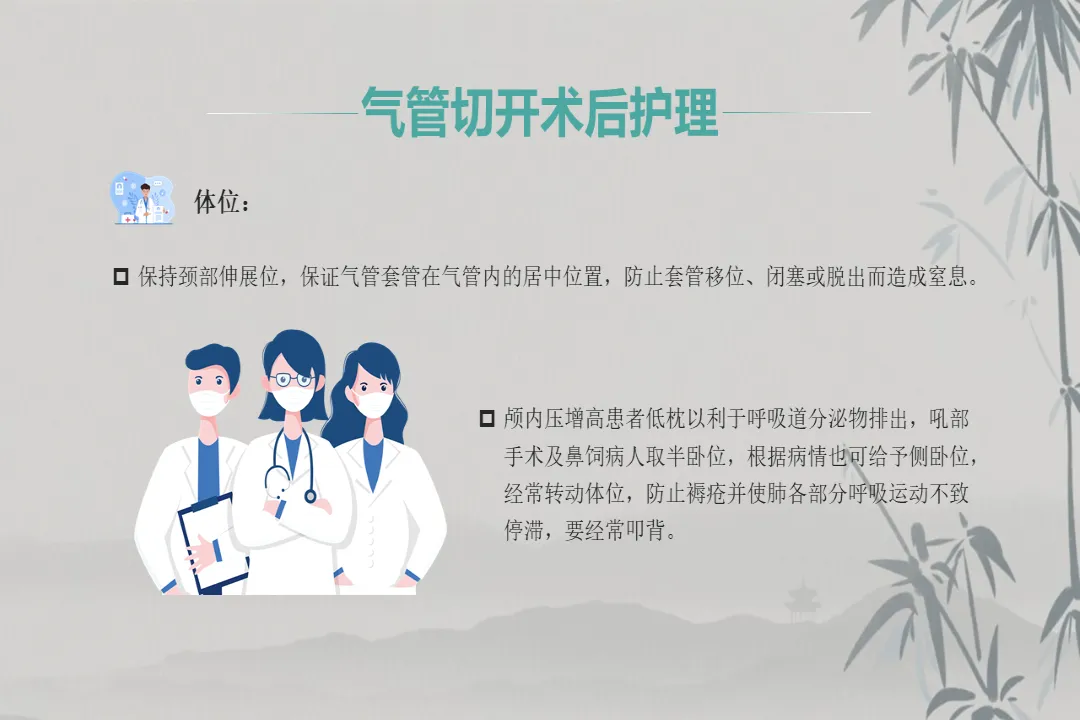 接下来重点讲解术后护理,这也是我们临床工作的核心,主要围绕九大要点开展。第一是环境管理,病室需宽敞通风,将室温控制在 20~22℃、湿度 60%~70%,每日开窗通风 3-4 次,每次 30 分钟,有条件可使用层流病房。第二是体位护理,保持患者颈部伸展位,颅内压增高者低枕,喉部手术及鼻饲患者取半卧位,定时翻身叩背,预防褥疮并保证肺呼吸运动正常。