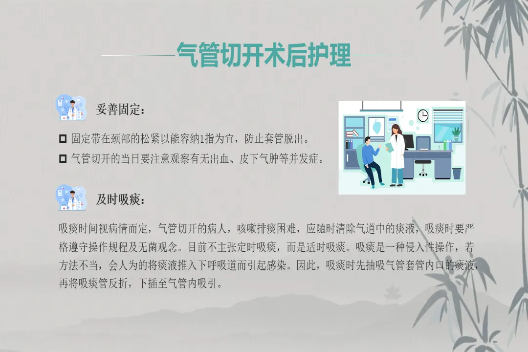 第三是妥善固定,套管固定带以容纳一指为宜,术后当日密切观察有无出血、皮下气肿等并发症。第四是及时正确吸痰,遵循适时吸痰原则,吸痰前翻身拍背、给予 3 分钟高浓度氧,操作时从浅至深,每次不超过 15 秒,动作轻柔避免损伤气道。第五是预防感染,保持切口清洁,金属内套管每日清洁消毒 3 次,口腔护理每日至少 2 次,疑有感染时及时做痰培养。同时要掌握正确的换药流程,严格无菌操作,内套管每 6-8 小时清洗消毒一次,取出时间不超过 30 分钟。
