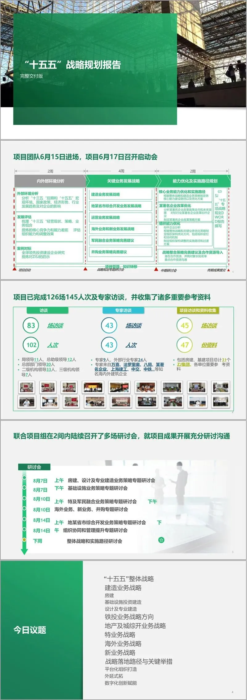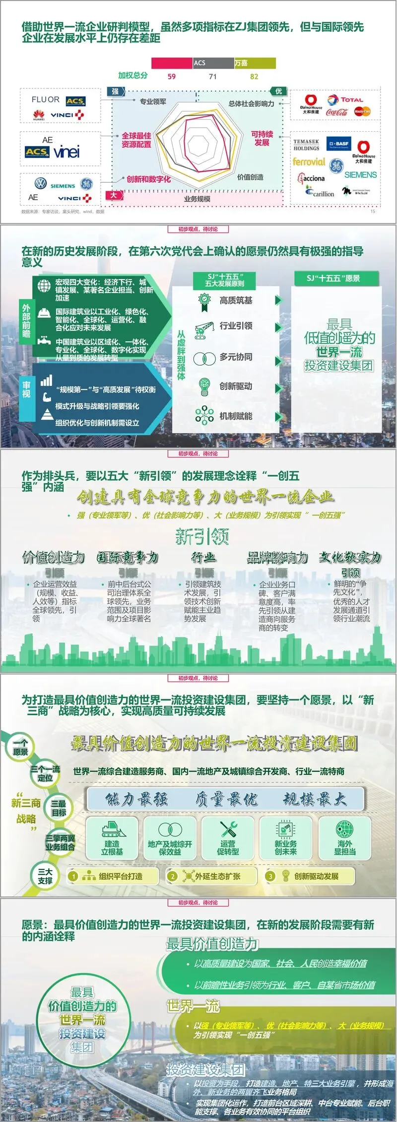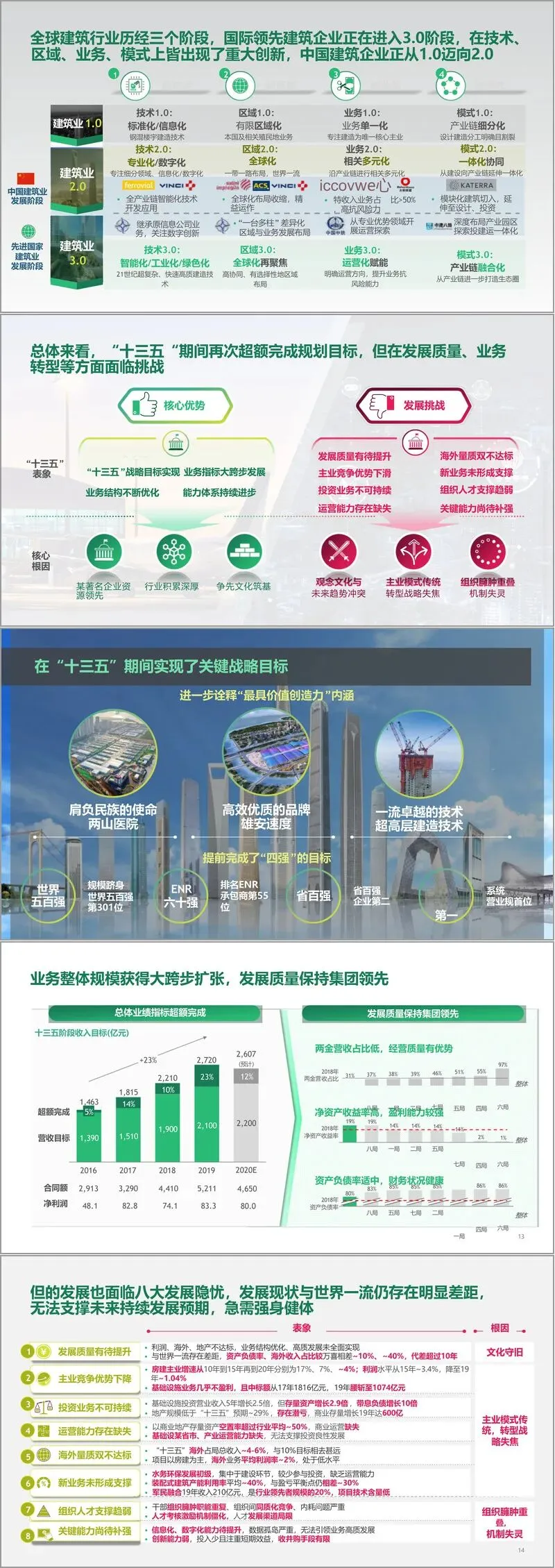内部发展评估显示,“十三五” 期间企业超额完成规划目标,业务规模与品牌影响力显著提升,跻身世界五百强与 ENR 六十强,在超高层建造等领域具备技术优势。但同时面临八大隐忧:发展质量有待提升,房建主业利润率下滑,基础设施业务盈利薄弱;主业竞争优势下降,核心业务增速与利润不及预期;新业务未形成支撑,装配式建筑产能利用率低,军民融合规模偏小;投资业务不可持续,地产与基建投资存在潜亏与资产空置问题;海外业务量质双不达标,收入占比与利润率偏低;运营能力缺失,商业与基建运营经验不足;组织人才支撑趋弱,机构臃肿、激励机制僵化;创新能力与数字化水平滞后。