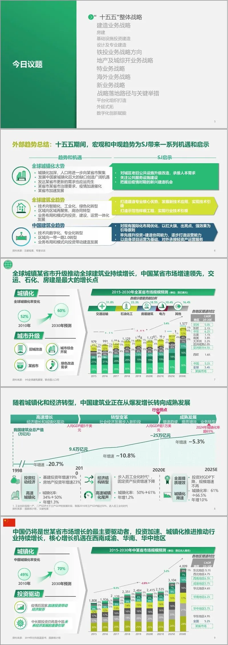 外部环境方面,全球城镇化持续推进,发展中国家城镇化缺口与发达国家城市更新需求并存,建筑业呈现智能化、工业化、绿色化转型趋势,区域聚焦与产业链一体化成为主流。中国建筑业正从爆发增长转向成熟发展,固定资产投资增速放缓,但投资仍是经济发展重要引擎,西南成渝、华南、华中地区为核心增长机遇区。国际领先建筑企业已进入 3.0 阶段,在技术、区域、业务、模式上实现重大创新,中国企业正从 1.0 向 2.0 跨越。