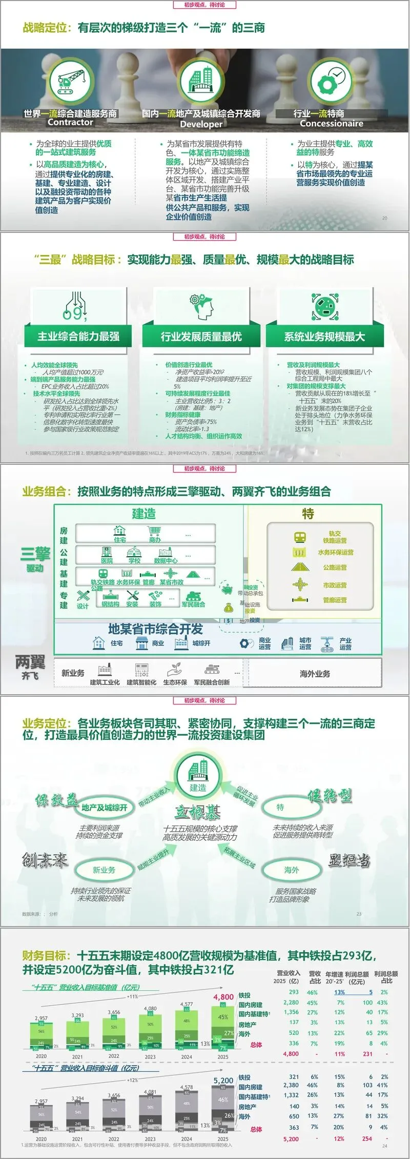 基于内外部分析,企业确立“最具价值创造力的世界一流投资建设集团” 愿景,遵循高质筑基、行业引领、多元协同、创新驱动、机制赋能五大原则,提出 “新三商” 战略定位:世界一流综合建造服务商、国内一流地产及城镇综合开发商、行业一流特许经营商。业务组合形成 “三擎两翼” 格局,以建造、地产及城综开、特许经营为核心引擎,海外与新业务为增长两翼,目标实现 “能力最强、质量最优、规模最大”。