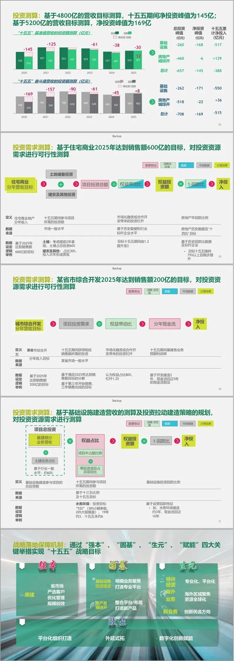 财务目标方面,“十五五” 末期营收基准值 4800 亿元,奋斗值 5200 亿元,净投资峰值分别为 145 亿与 169 亿。各业务板块明确发展重点:建造业务聚焦房建、基础设施投资建造等领域,树立 “强能力、优质量、稳规模” 目标;房建业务优化细分结构,聚焦核心区域与高潜领域;基础设施投资建造抢抓轨交、水务环保等黄金机遇,打造 “521” 区域格局;设计及专业建造以赋能主业为核心,强化 EPC 能力;铁投公司优化业务布局,打造铁路业务旗舰;地产及城综开区域深耕与产品拓展并举,提升市场化融资与运营能力;特许经营业务重点布局水务环保、地下管廊等领域,培育专业运营能力;海外业务聚焦 “一带一路” 沿线高潜国家,逐步升级业务模式;新业务紧跟建筑工业化、智能化、绿色化趋势,重点发展建筑工业化、智能化、水务环保、军民融合。