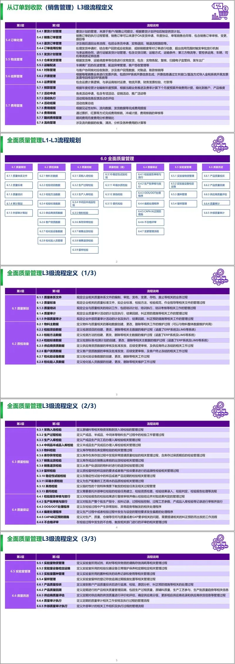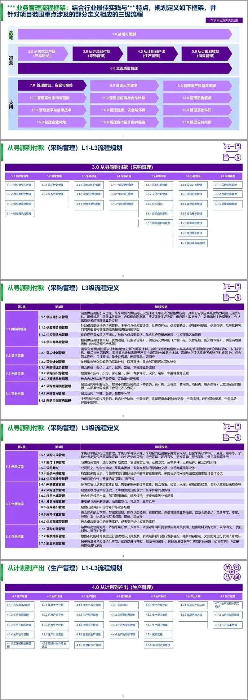 方案首先明确业务流程框架,将企业流程划分为五级,本次项目聚焦三级流程建设,涵盖战略、运营、支持三大类一级流程,其中运营类重点包括从寻源到付款、从计划到产出、从订单到收款等核心业务链,同时明确了流程所有者职责与跨部门协同机制,通过流程优化评审会、异常流程评审会等会议机制保障流程持续优化。
