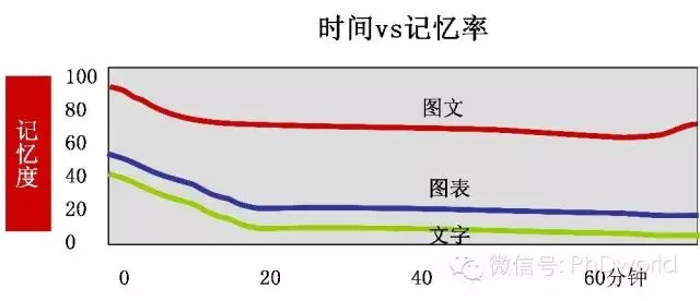 首先我们来看一张图,这是一张从互联网下载来的示意图,这张图很好地表述了人的大脑在对于图文、图表和文字的记忆曲线。从图中可以看出,听众的大脑对于图文的记忆所需的时间是最短的,而对于图表和文字的记忆时间需要一段时间。通常演讲者在放映PPT时,每张片子停留的时间都不会太长,考虑到这个因素,在做PPT时能用图文展示的尽量用图文,其次再考虑使用图表或者文字。于是也可得出一个结论:最好的记忆PPT的方式是图文并茂。