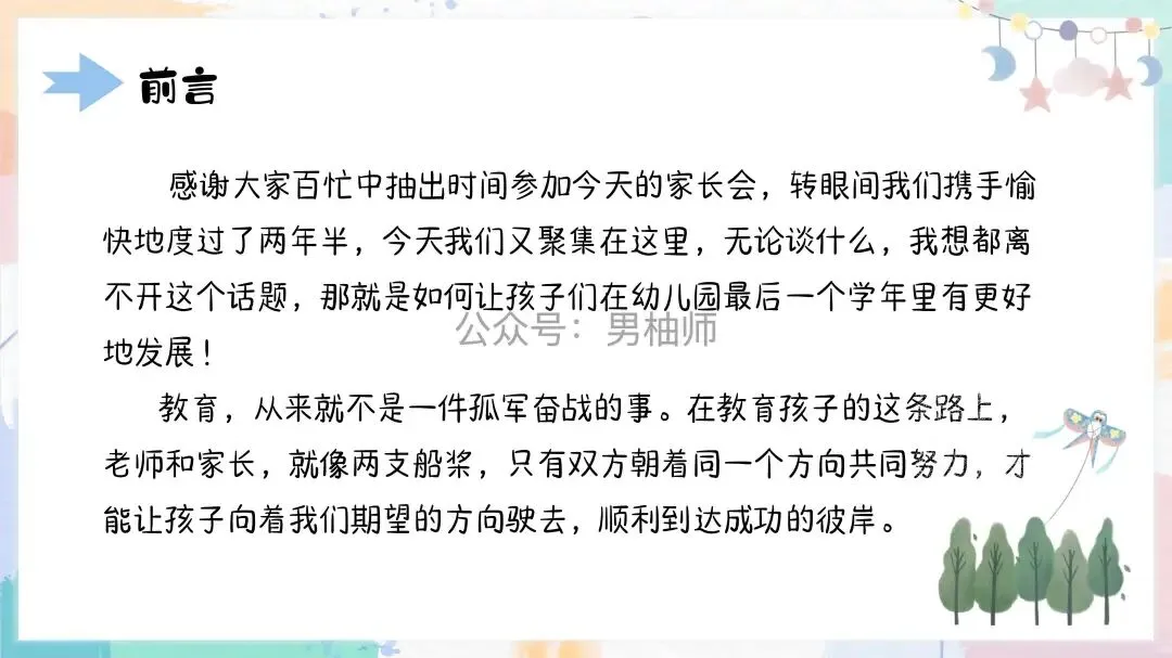 感谢大家在百忙之中抽出时间参加今天的家长会。转眼间,我们已携手愉快地度过了两年半。今天我们再次相聚,无论讨论什么,核心都离不开一个话题:如何让孩子们在幼儿园的最后一个学年得到更好的发展!