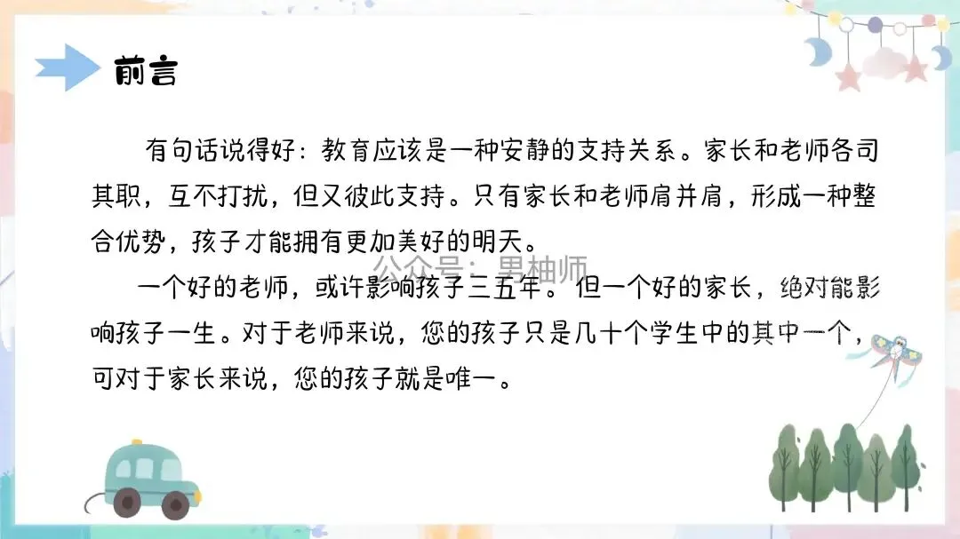 有句话说得好:教育应是一种安静的支持关系。家长和老师各司其职,互不干扰却又彼此支持。只有家长和老师肩并肩,形成整合优势,孩子才能拥有更美好的明天。