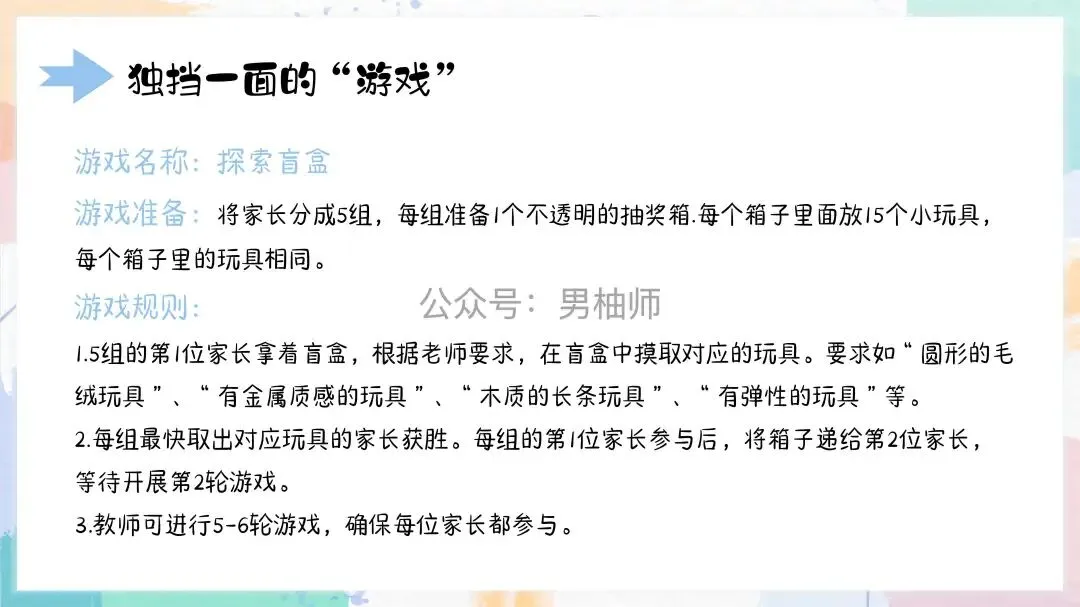 - 5 组的第 1 位家长拿着盲盒,根据老师要求,在盲盒中摸取对应的玩具。要求如 “圆形的毛绒玩具”“有金属质感的玩具”“木质的长条玩具”“有弹性的玩具” 等。