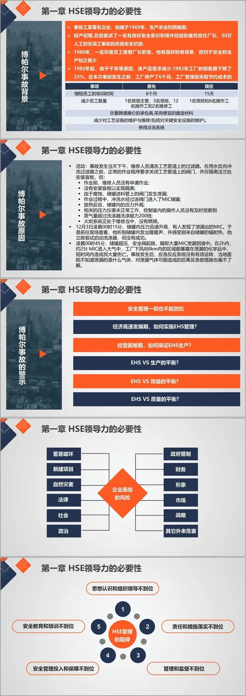 教材开篇通过印度博帕尔毒气泄漏事故,凸显 HSE 领导力的必要性。该事故因企业管理层安全意识薄弱、削减安全投入、缩短培训时间、忽视设备维护等,导致重大人员伤亡与损失,警示企业无论经营状况如何,安全管理都不可松懈,需平衡好 HSE 与生产、效益、质量的关系。同时,指出企业面临蓄意破坏、自然灾害、法律监管等多重风险,而思想认识不足、管理监督缺位等是 HSE 管理的主要阻碍,事故会对员工、股东、公众、客户等利益相关方造成严重负面影响,强调管理层领导力与执行力在 HSE 管理中的核心作用,需通过培养安全意识、识别差异并改善来预防事故。